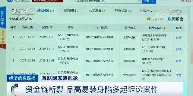 记者通过天眼查发现,目前广东品高易装工程管理有限公司司法风险高达174条,涉及大量的法律诉讼,从2019年10月起,公司连续20次被佛山市顺德区人民法院列为失信被执行人。