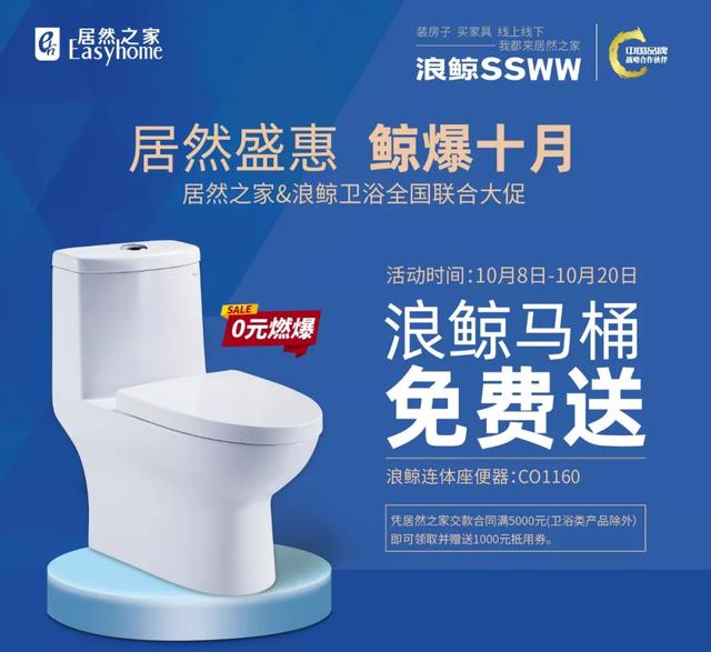 钜惠亮点一:浪鲸马桶免费送,凡是凭居然之家交款合同满5000元(卫浴类产品除外)即可领取浪鲸卫浴CO1160连体座便器并赠送1000元抵用券;