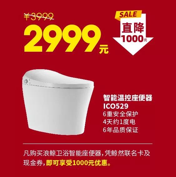 钜惠亮点三:智能坐便器直降千元,凡是购买浪鲸ICO529智能温控座便器,凭鲸然联名卡及现金券,直降1000元;