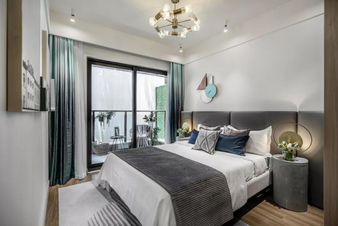 卧室以优雅灰、蓝色调与简洁的几何形装饰品为主要元素。低纯度、对比弱的灰色背景墙,即使大面积使用也不会有强烈的感觉,再搭配空间不同明度的灰色,使空间更具层次感,尽显知性柔和。在以无色彩为主的空间中点缀以Tiffany蓝,削弱了空间单调、乏味的印象,赋予空间更丰富的活力。
