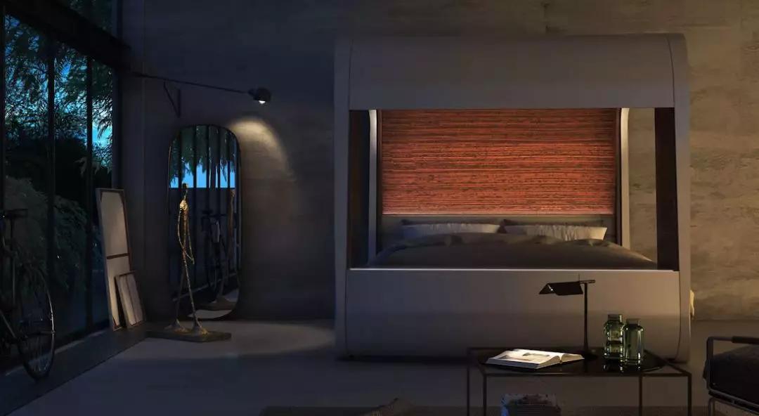 床的两侧设计了可以自动升降的遮光帘,让床本身成为一个独立的“卧室”。