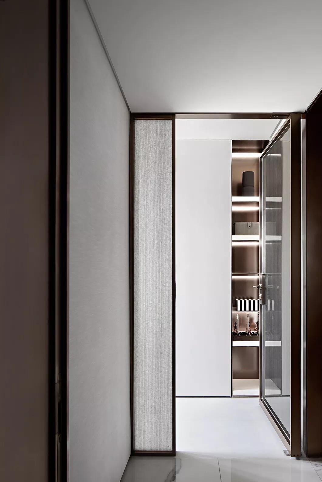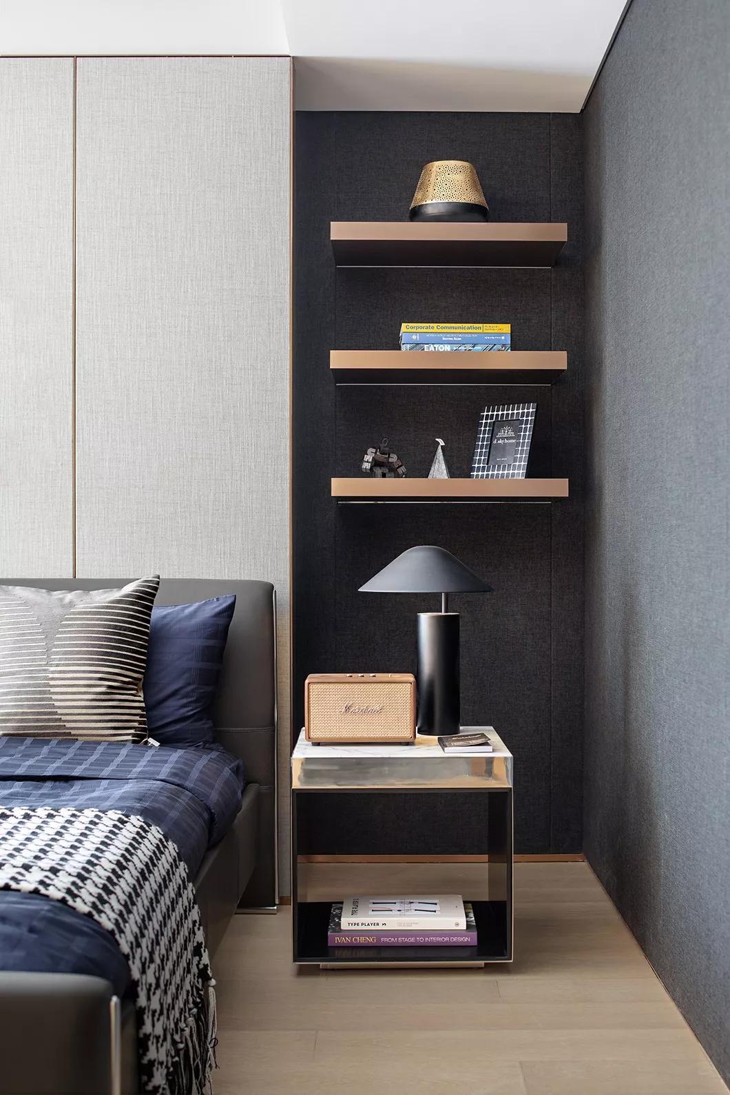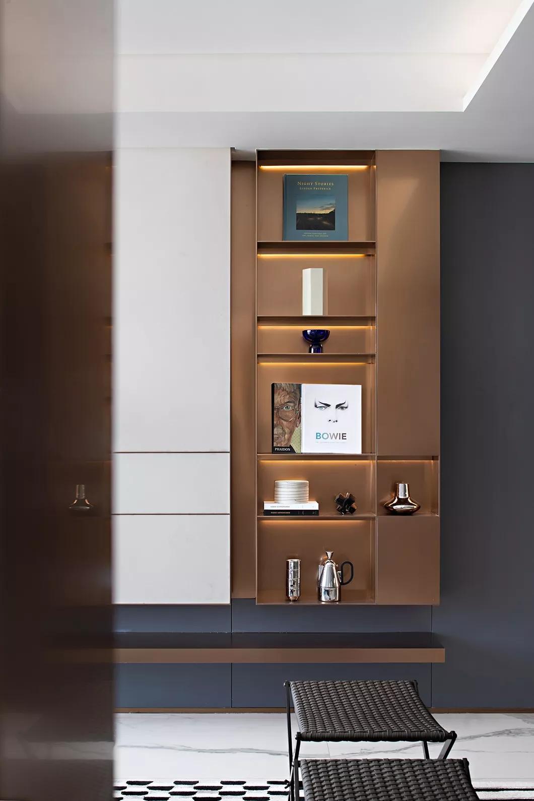 空间里特定的材质及颜色不停地在重复出现,建立一种秩序空间的和谐与精神。于不动声色中为空间赋予可感知的生活态度。玄关栅栏的玫瑰金在冷酷的空间色调中泛着温柔的冷冽,在空间中重复出现,包括客厅的电视柜,及卧室的背景墙,隐约中似乎感觉到这个空间的主人冷静的外表下好奇探索的内心。