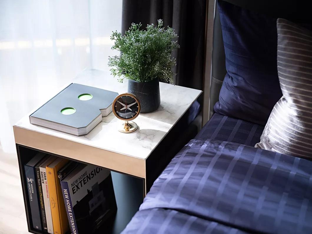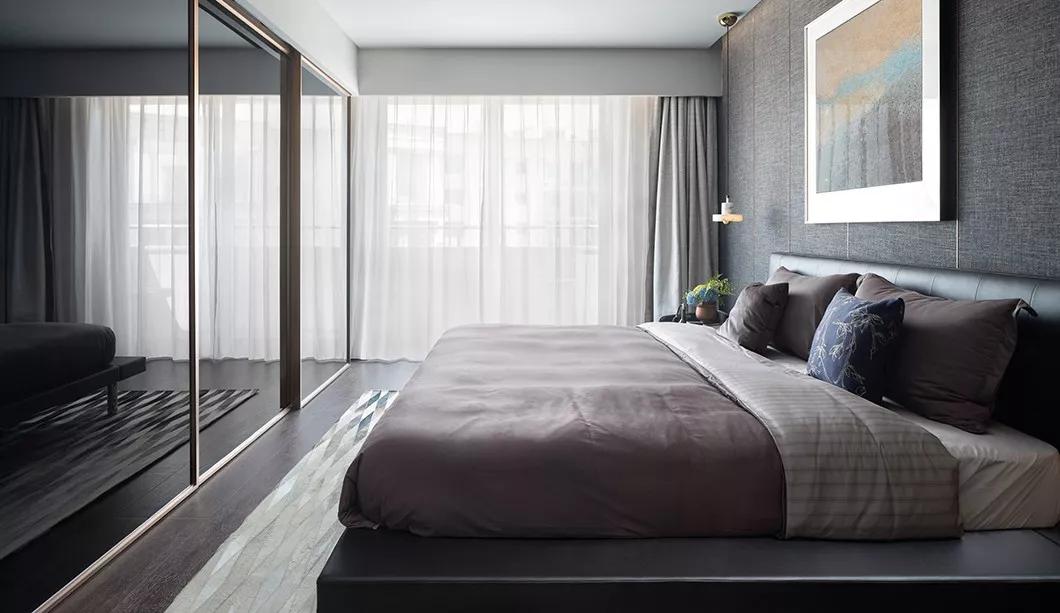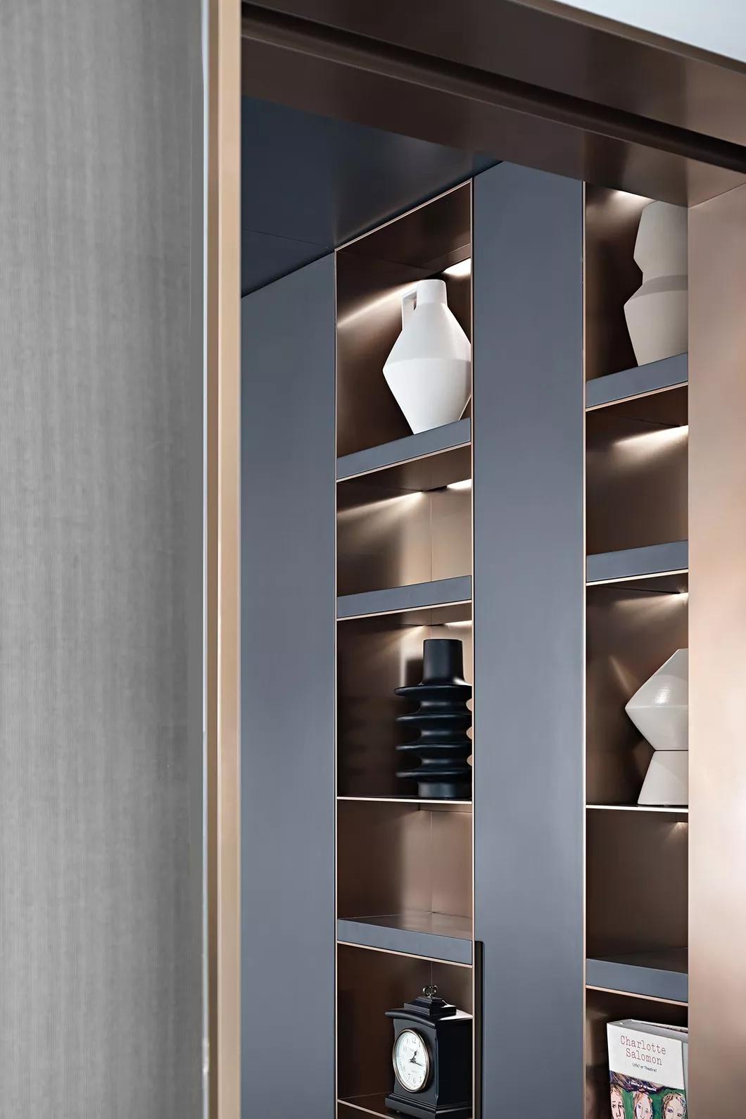 空间里特定的材质及颜色不停地在重复出现,建立一种秩序空间的和谐与精神。于不动声色中为空间赋予可感知的生活态度。玄关栅栏的玫瑰金在冷酷的空间色调中泛着温柔的冷冽,在空间中重复出现,包括客厅的电视柜,及卧室的背景墙,隐约中似乎感觉到这个空间的主人冷静的外表下好奇探索的内心。