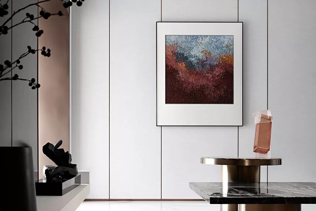 田丹露作品表现的“光点色彩”不是向纵深的空间发展的,平面化构形原则对画面起着控制性的意义。一种形式趣味的语言和力量隐藏在其中,那种建立在堆塑般的浅浮雕的点状肌理表面,让视觉有了另意的敏感。细腻优雅的美学风格与中熙设计对空间的诠释相互碰撞糅合,没有花哨的造型,没有浓重的色彩,简单而不失质感的设计给人带来一种别样的视觉享受。