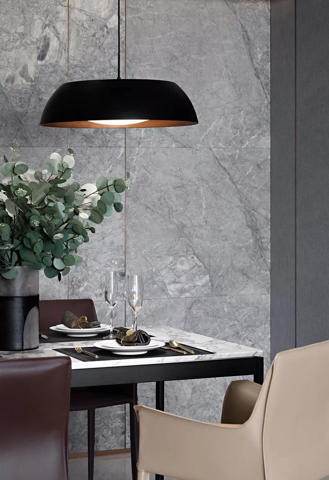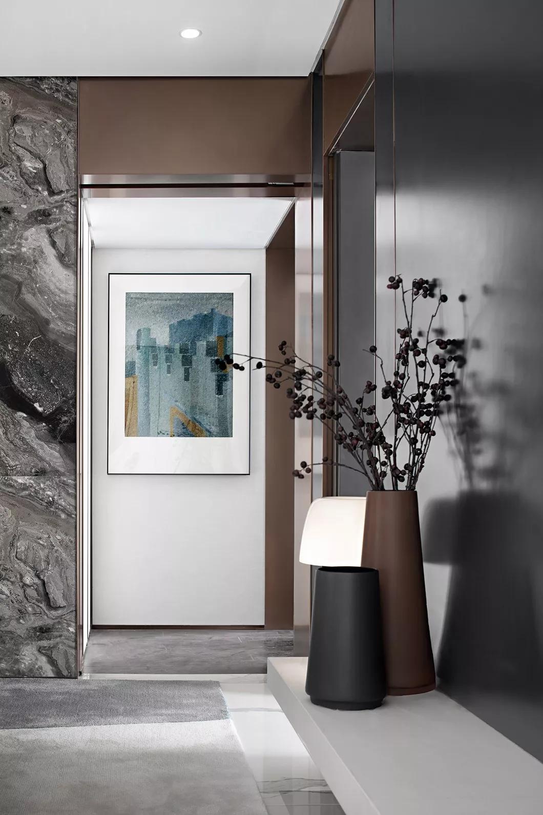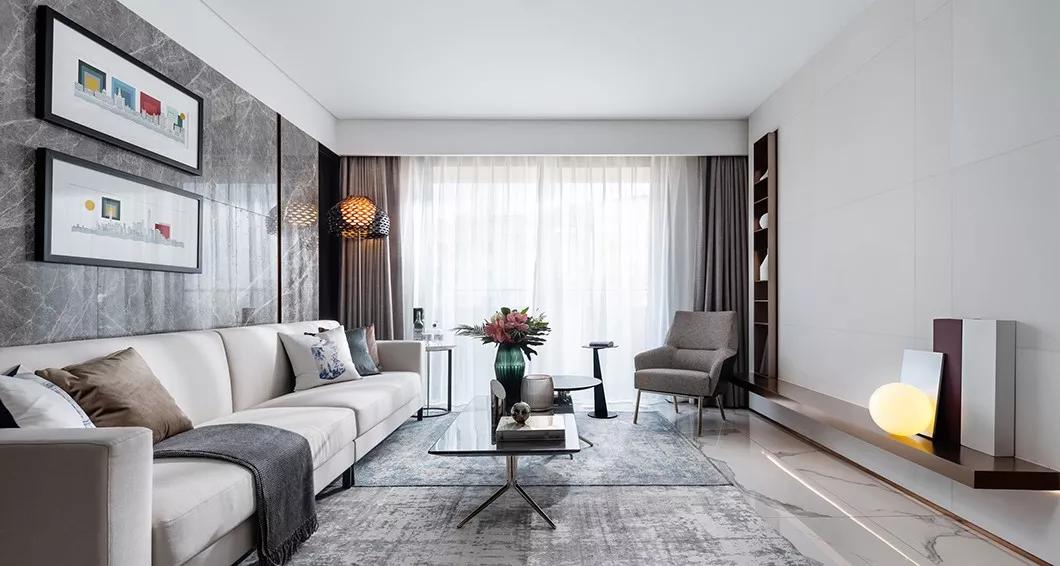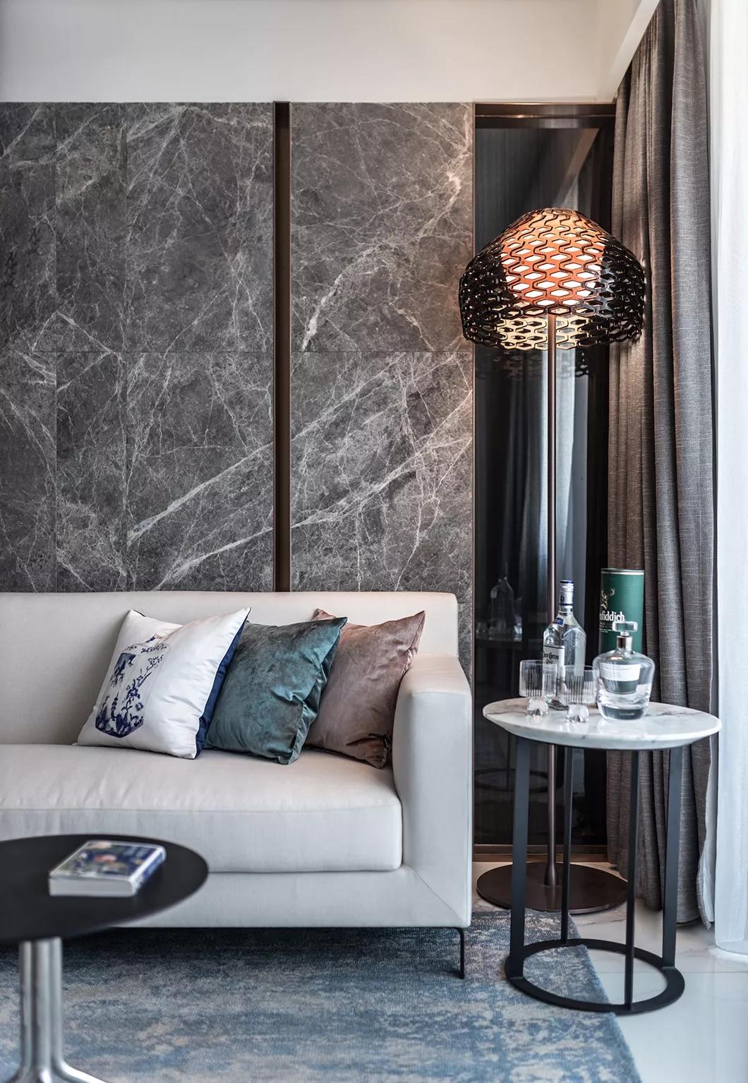 空间采用中性色调与简洁利落的纹理与造型,赋予空间鲜明独特的个性。混色大理石结合金属质感的柜体,利用木质、玻璃、金属这些工业性较强的材料,高级纯粹灰色系的巧妙融合,完美地呈现了现代奢华的格调。