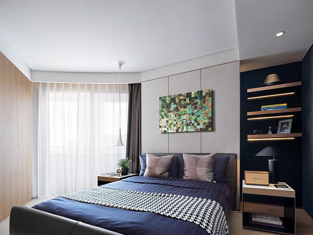 房间采用跳跃的色彩搭配,营造出年轻活力的氛围。宝蓝色软装配色的使用令整理空间秩序感更强,家具中大胆启用了金属、大理石、瓷砖等材质,并从展示了主人环游世界的不同收藏,酷劲与优雅并存。