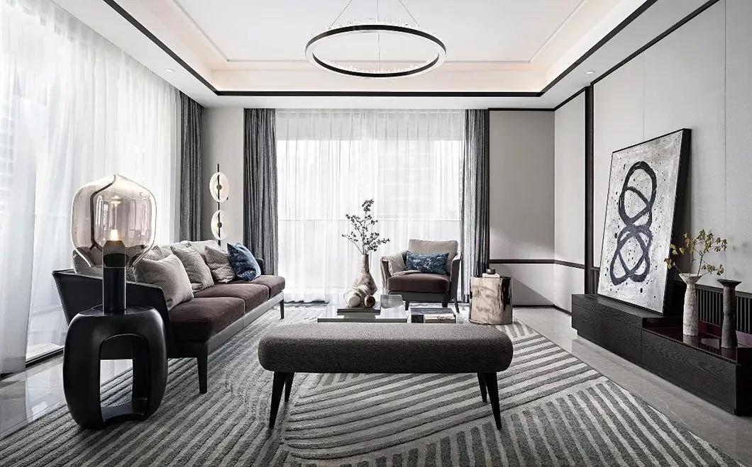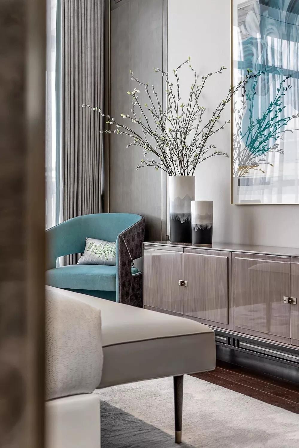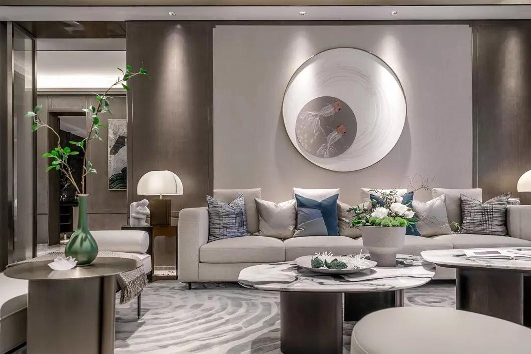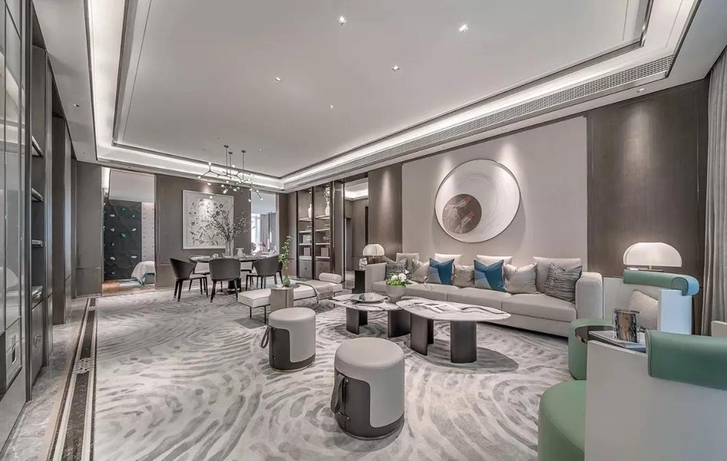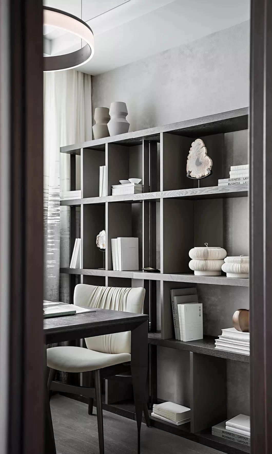 设计师通过艺术的手法抒写艺术与想象交融的意境对话,浅棕调木饰面带着一方清冷与理性,加之中灰调背景墙、家具布艺,带来素净、优雅视觉观感,黑白灰意境大理石纹理描绘出水波荡漾的波澜感。