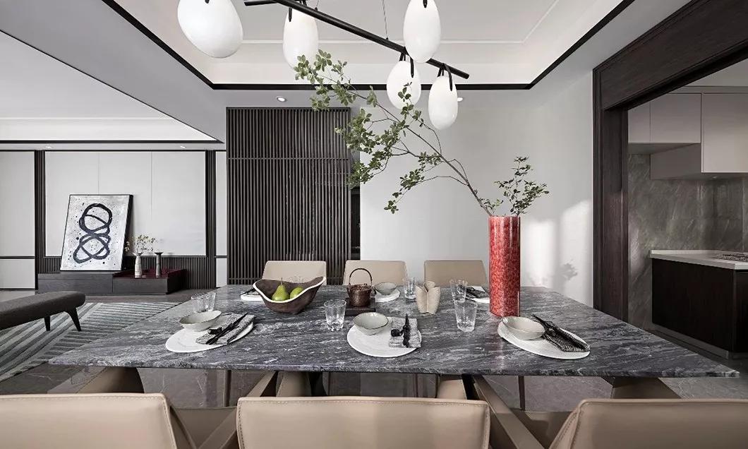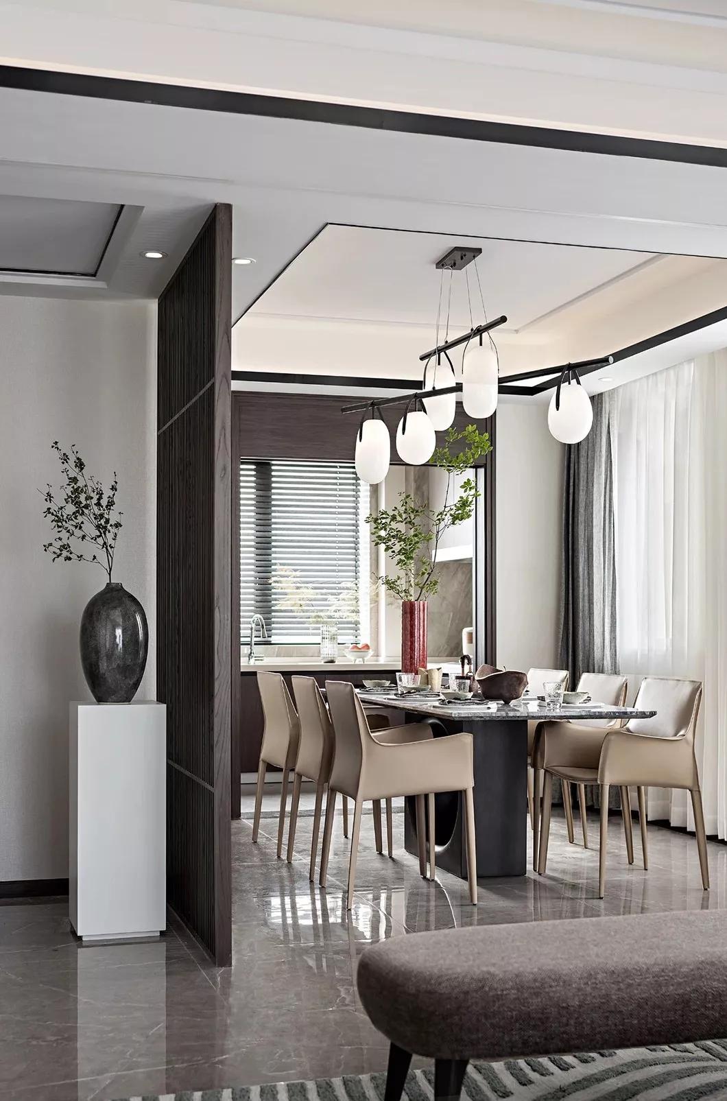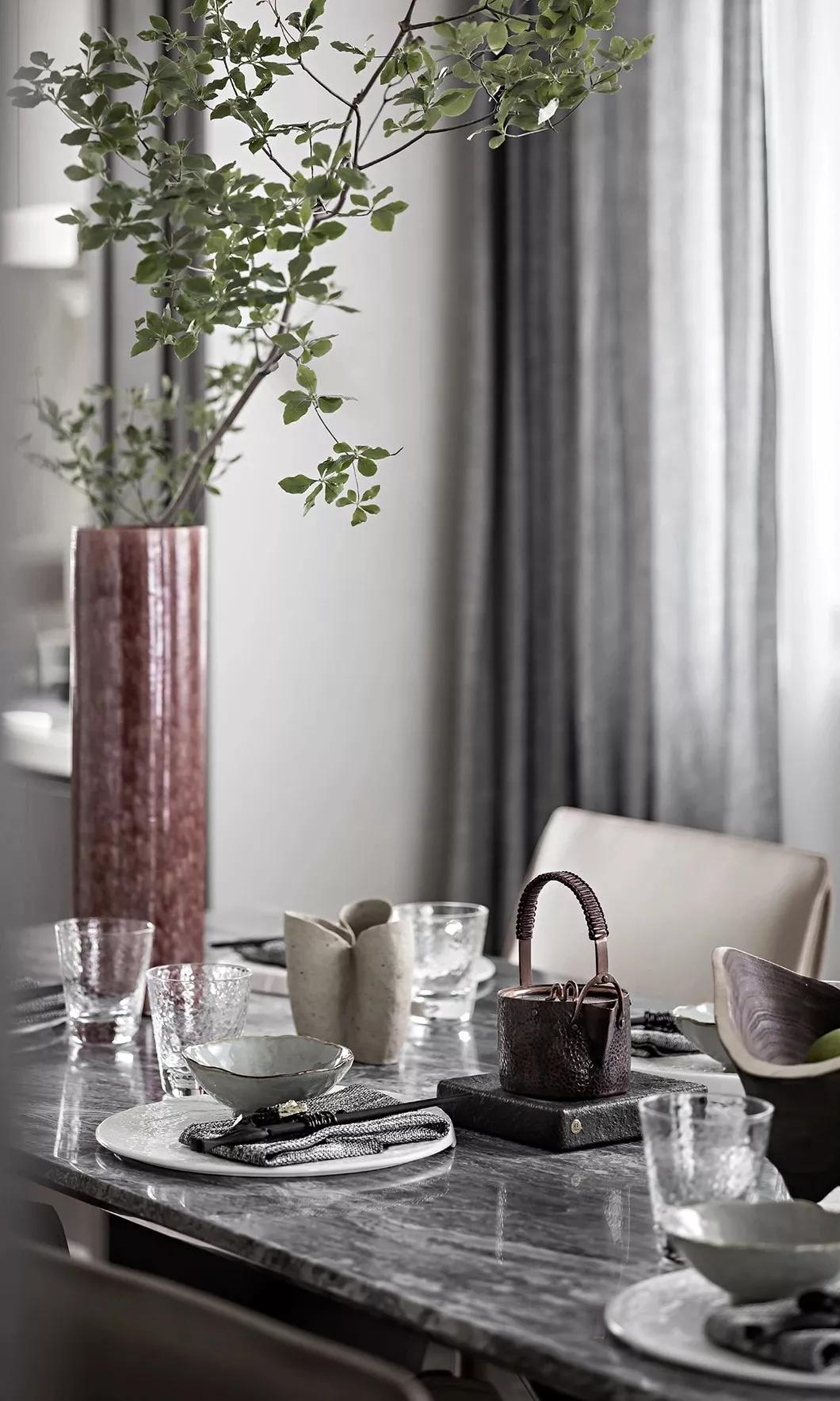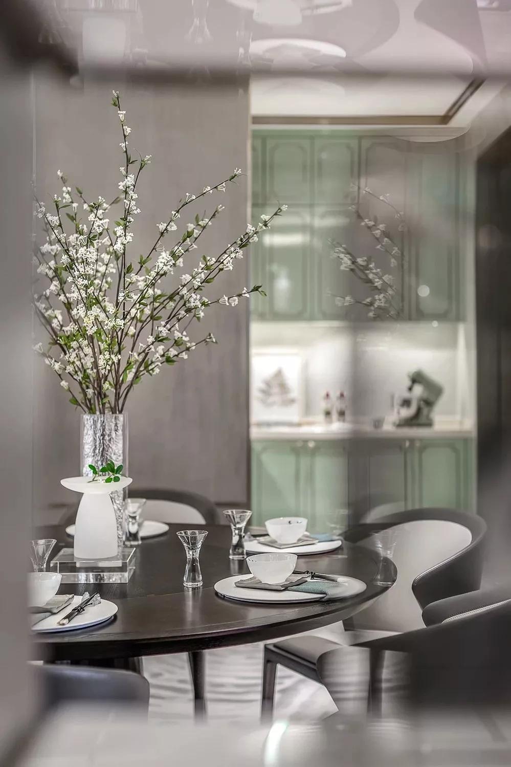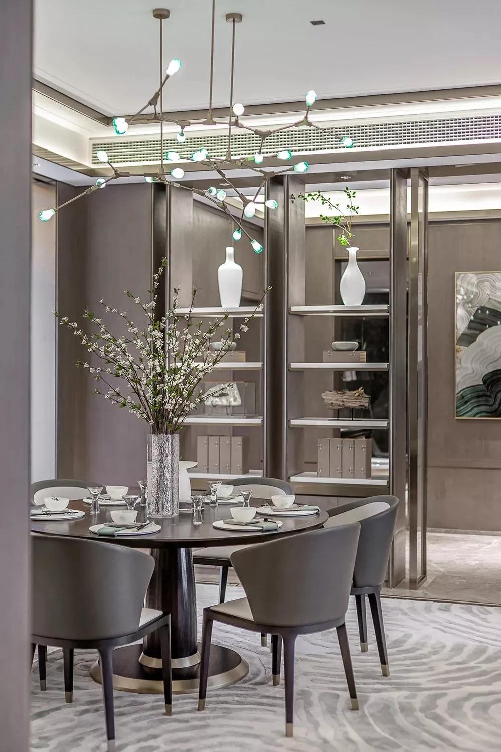 极具设计感吊灯为空间加注灵气,餐桌餐椅与空间整体色调一致,给人沉稳尊贵印象,杯盘温润,加以金属构件装饰,为视觉路径创造停留点。