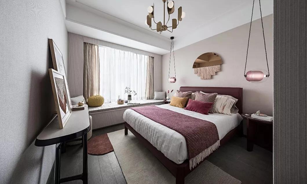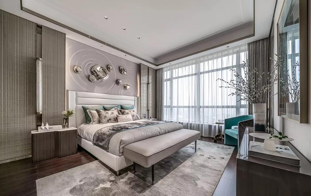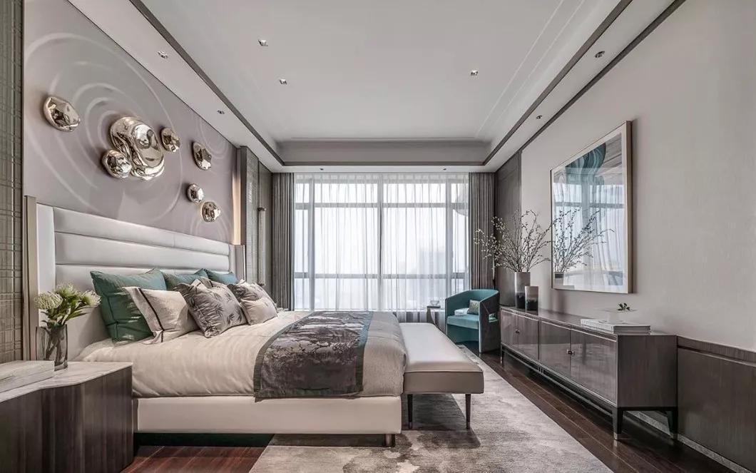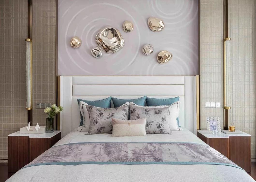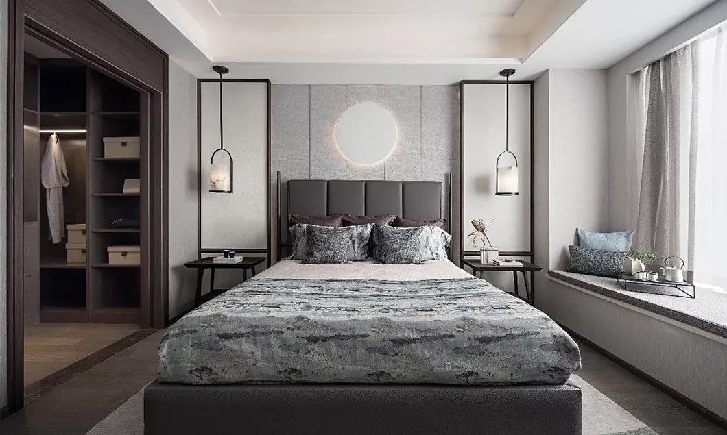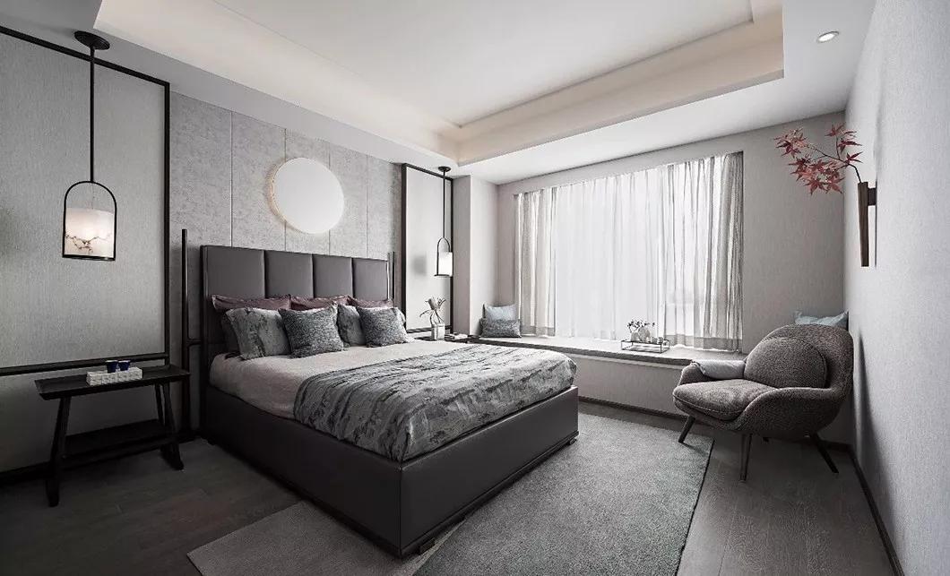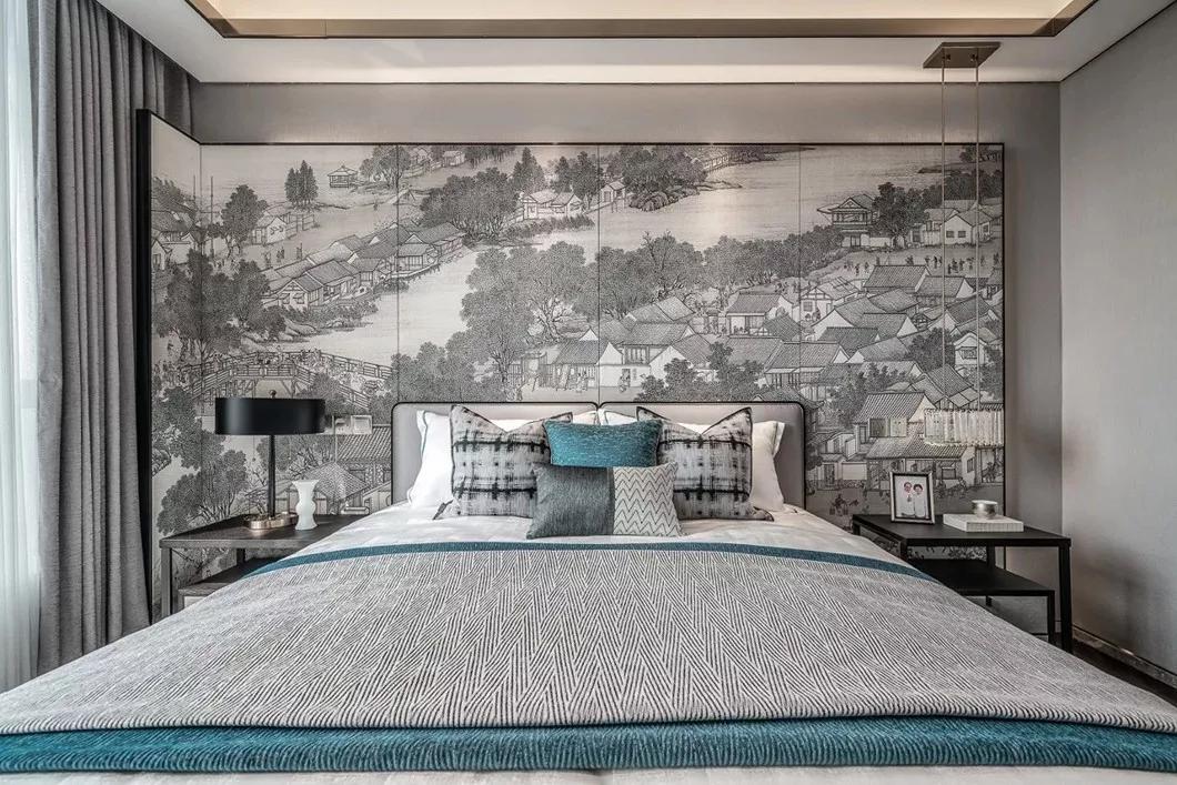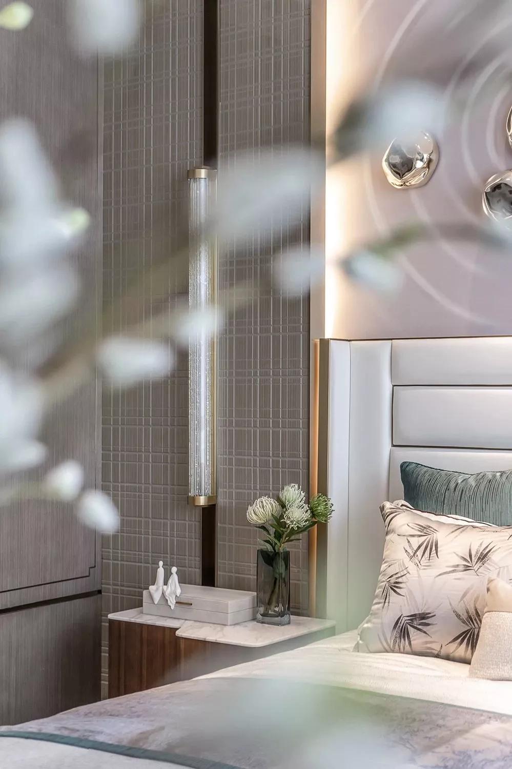 主卧空间,融入东方禅意哲美,轻漾出一片涟漪的水纹与山石布局无限通达心境况味,是乍见之欢的视觉感染,更是久处不厌的灵魂陪伴。