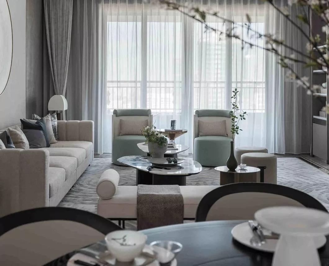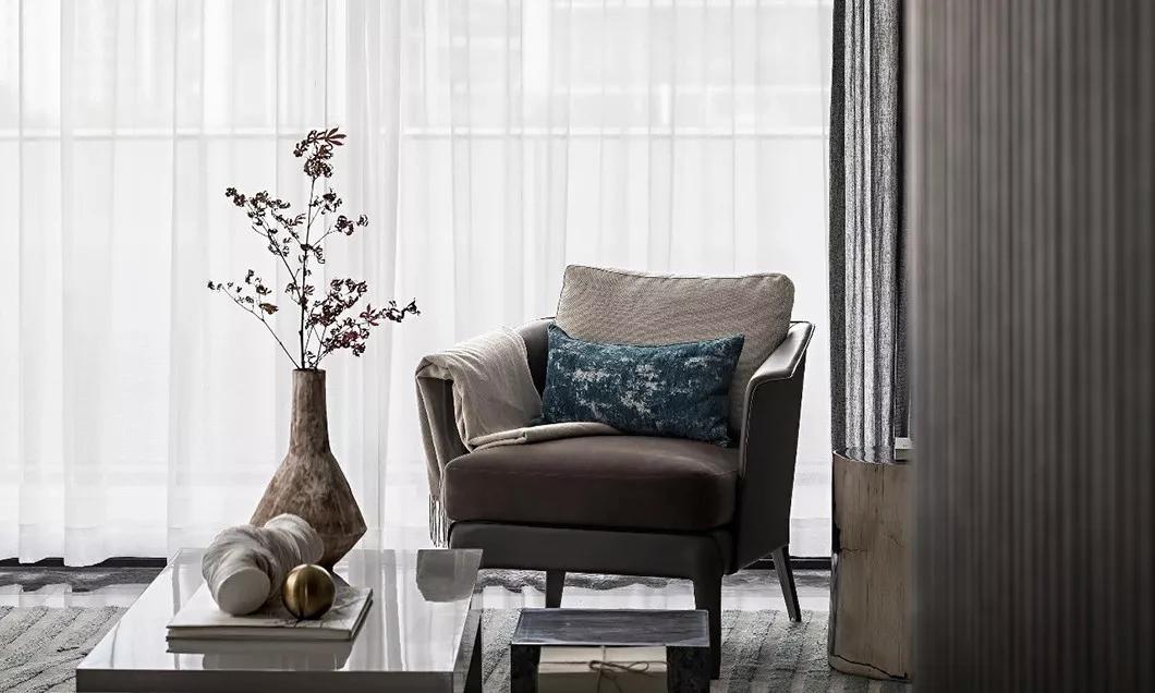 客厅以简洁柔和的中性色为基调,通过深沉暗雅的色相过度、自然纤维的融合渗透,把生命体无形的能量融入其中,创造出独特的审美,传递着当代东方美学的安然、笃定和恒久。