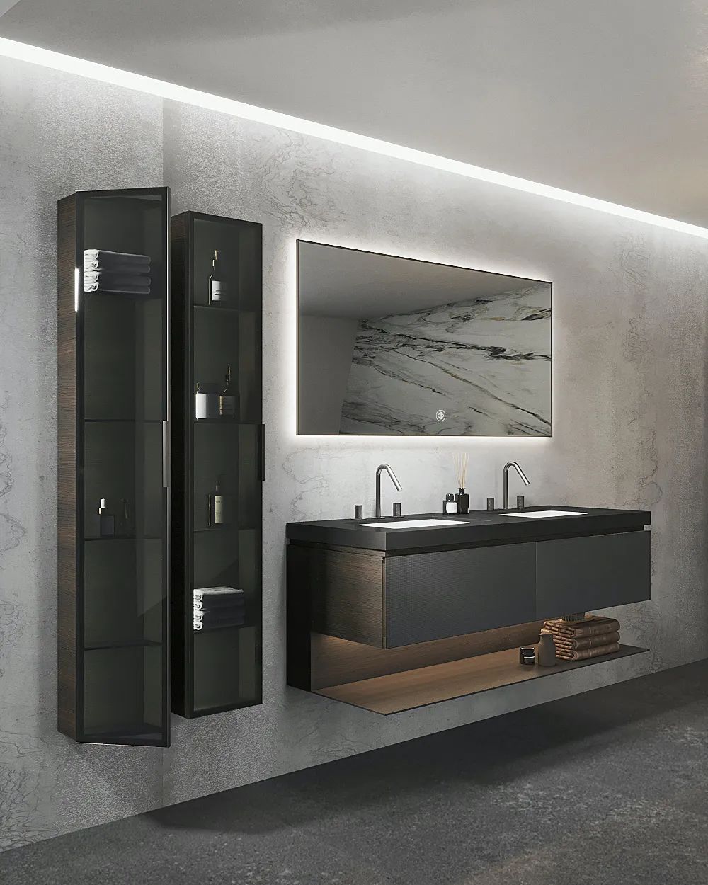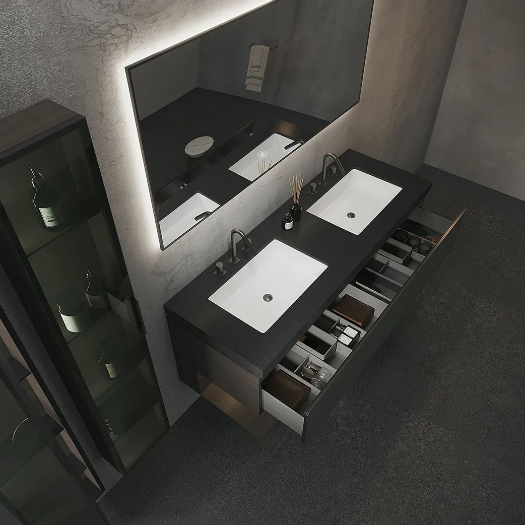【珍材混搭】血肉是高贵的白蜡木,外表是酷感的铝合金,台面是睿智稳重的温斯顿黑岩板,而「他」对生活的细致观察,都从那铝合金边框背光镜中折射出来。多种材质交织演绎的主角产品,是高定卫浴的主旋律。