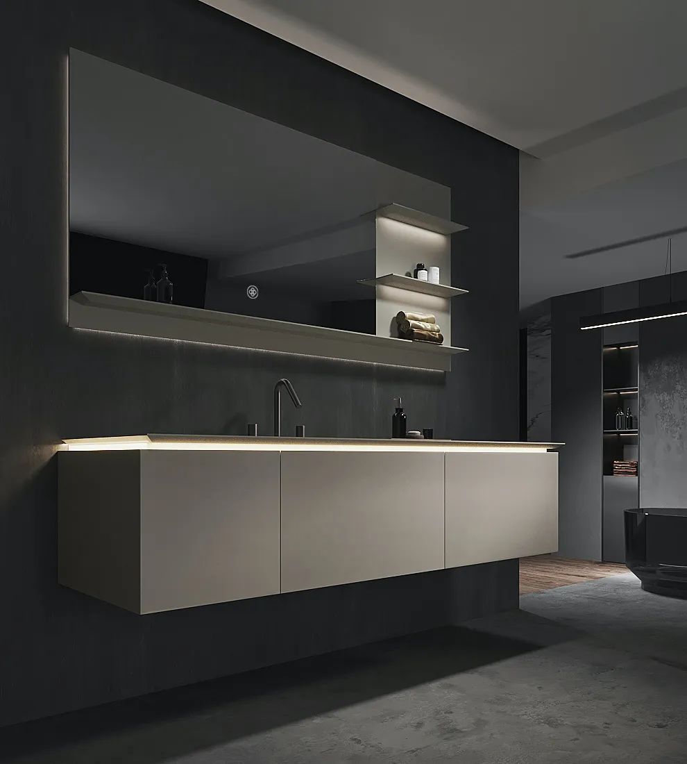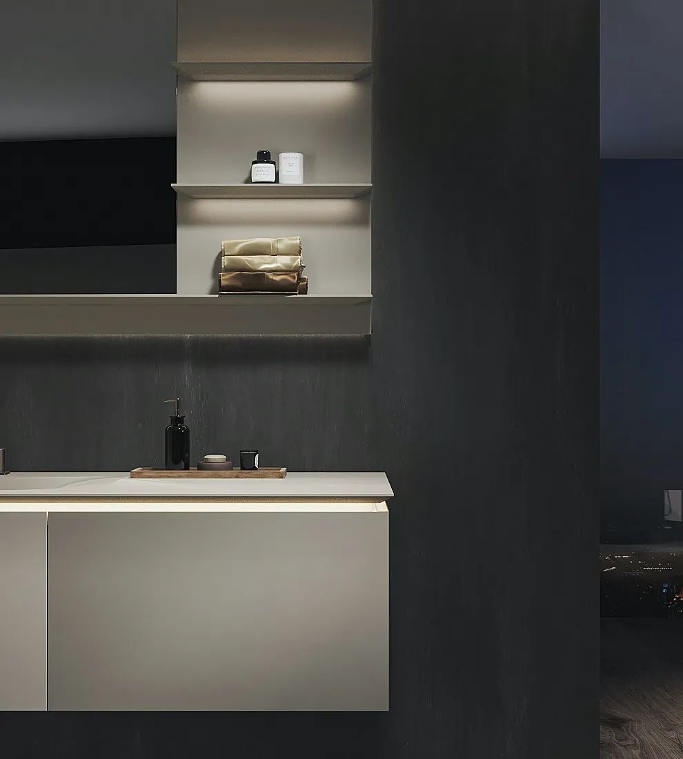 【极酷布光】大镜环绕式发光、抽屉感应式开合内发光,边柜嵌入式开合发光,形成丰富饱满的氛围灯光。感应式照明非常人性化。亮起的不是灯光,而是精致生活的愉悦心情。