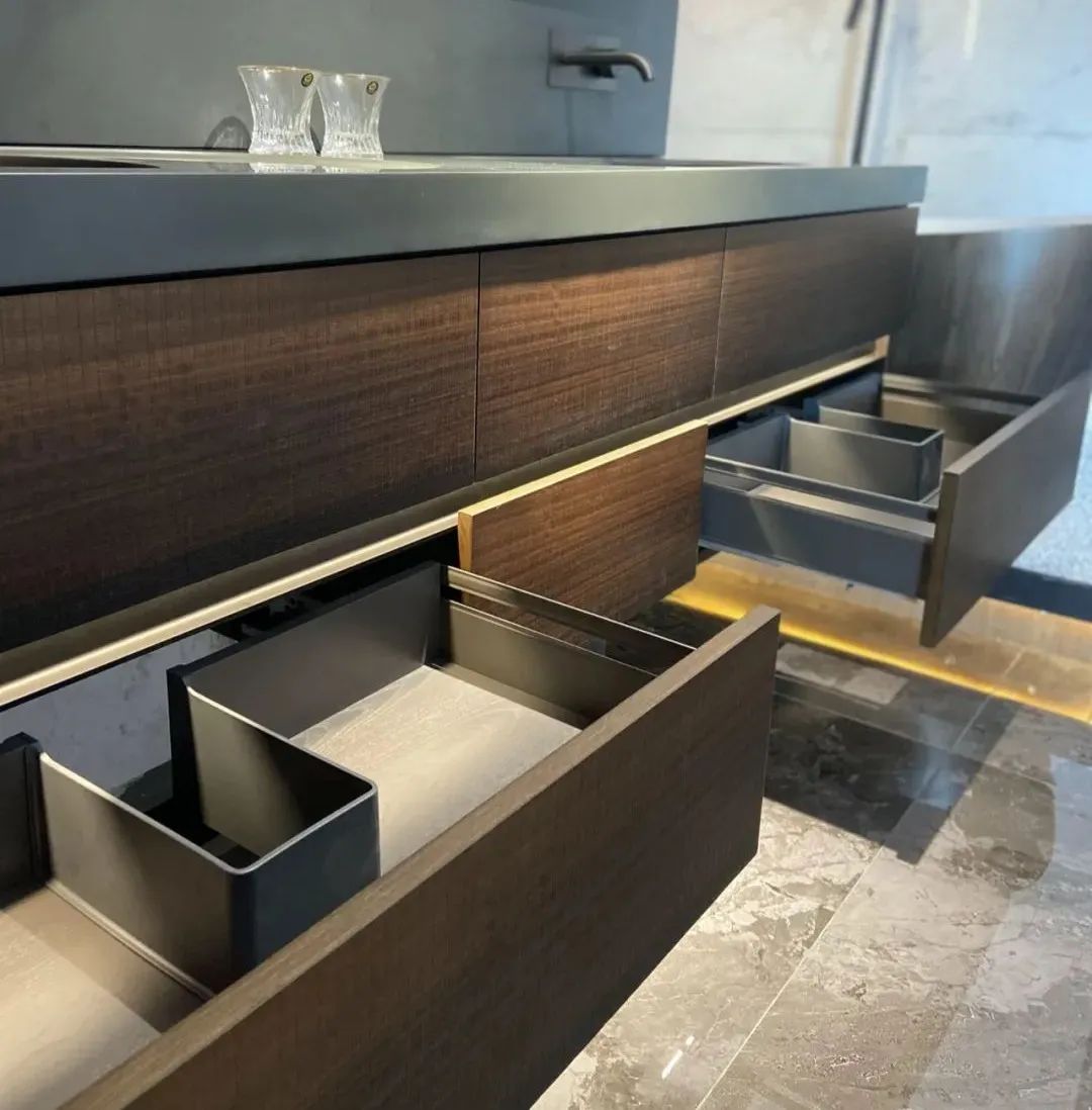 作为行业独一家拥有奇美石生产线的企业,百世和木率先使用奇美石一体成型台盘,不仅填补市场空白,更突破性实现台盆无缝无卫生死角。造型百变的奇美石搭配现代榫卯柜,不仅提升产品价值,更演绎出令人惊艳的艺术品,在行业和市场上形成压倒性优势。