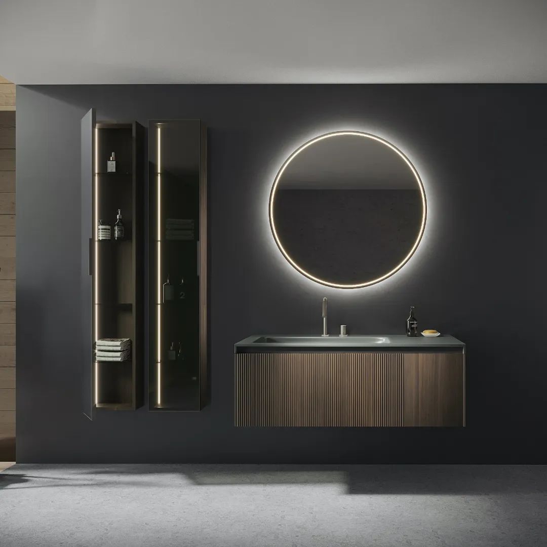 2022年,百世和木推出国际领先的木皮工艺新品,为榫卯浴室柜穿上名贵北美黑胡桃“皮草”,严丝合缝的完美细节,展现了问鼎行业的大匠手艺,“见木不见油”的光泽与质感,同样达到国际展览的领先水准。