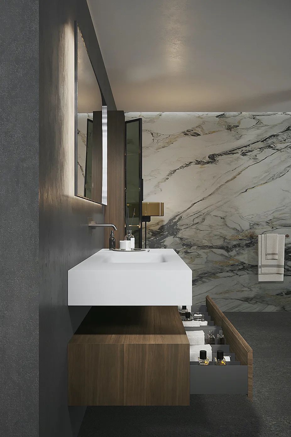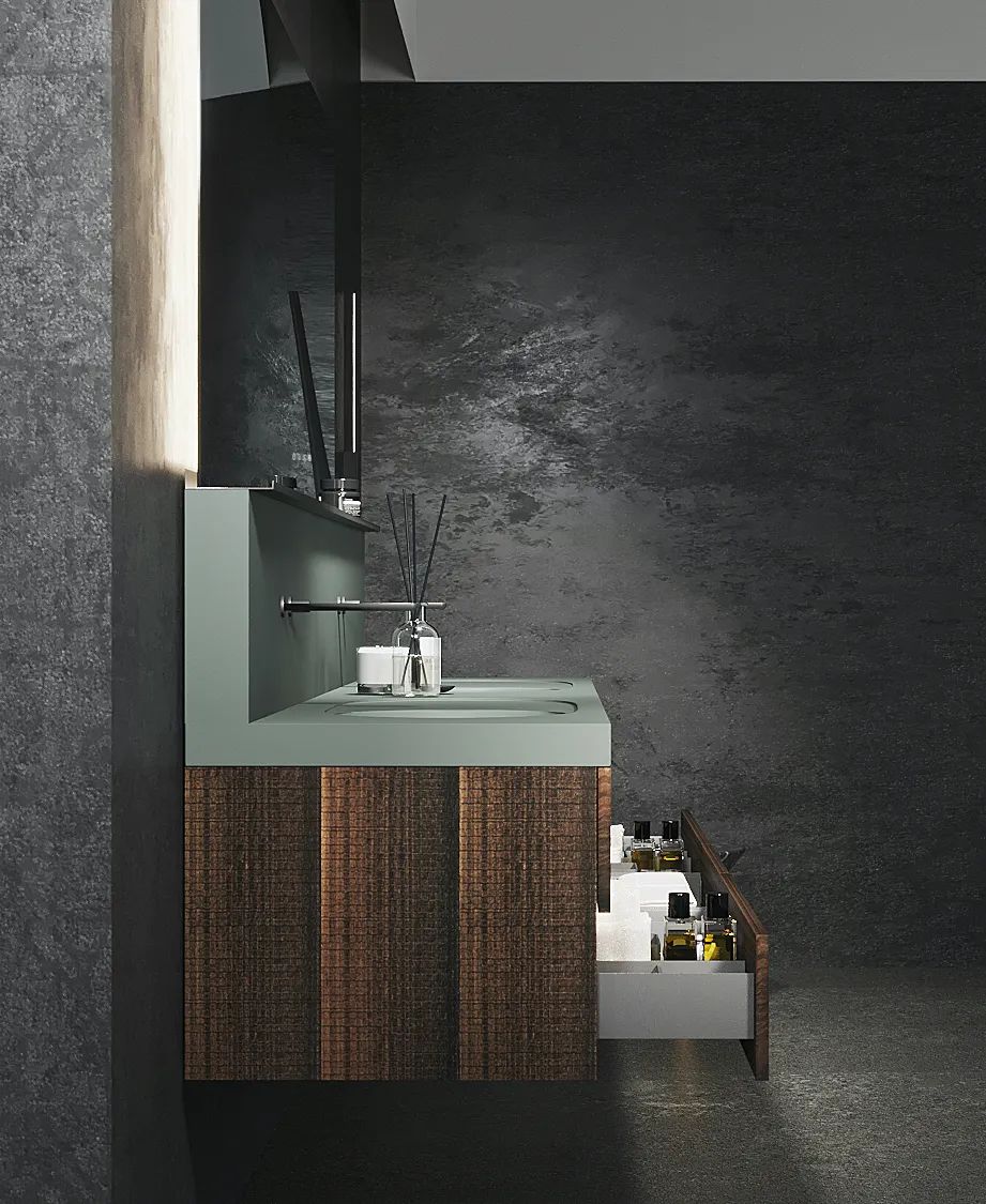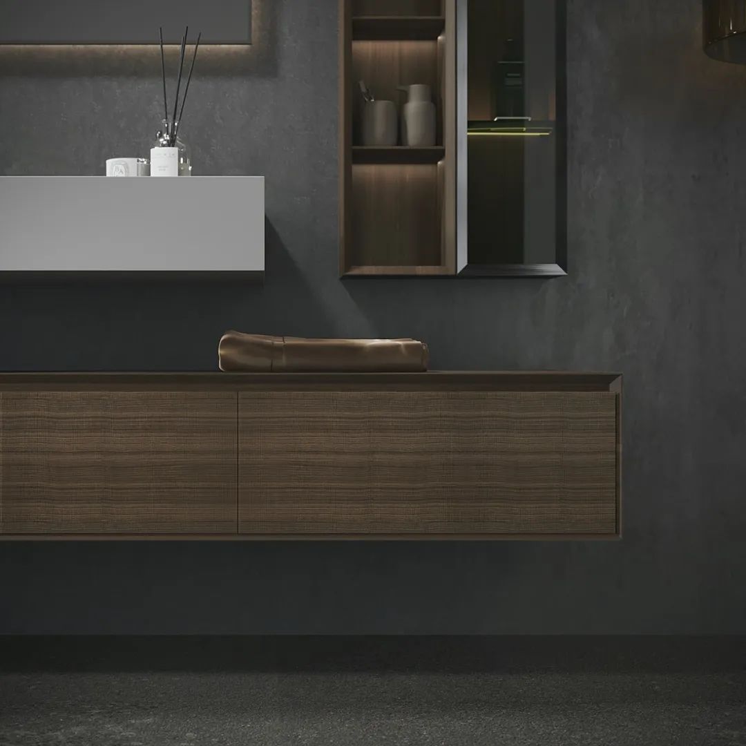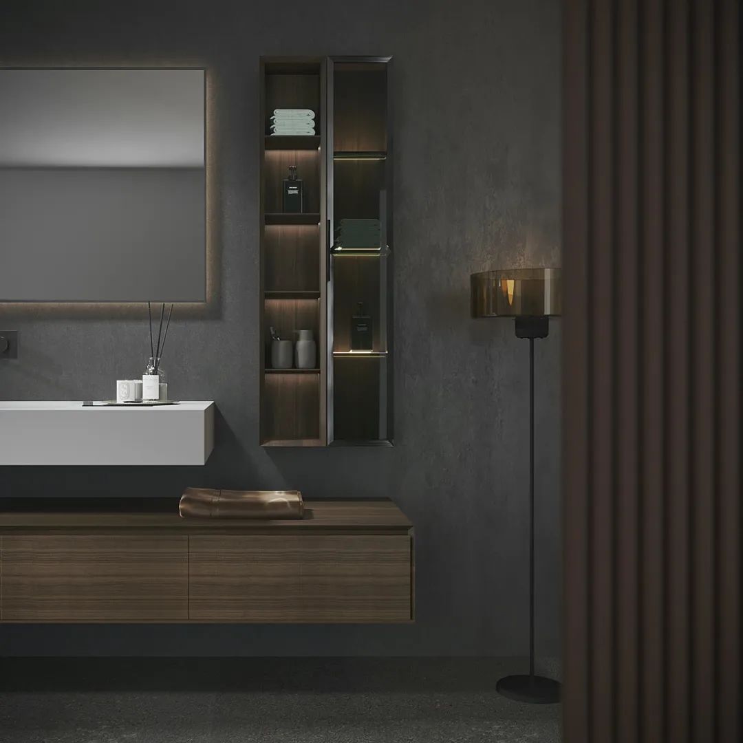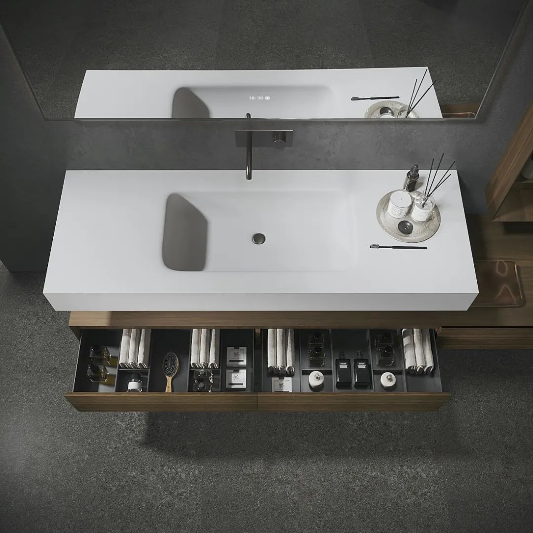【分体结构】针对大平层的宽阔户型与纵深空间,这款柜采用台盆与柜体独立分体、双层悬空的灵活设计;主体与边柜以2:8比例构成,错落有致的结构体,让整体呈现出建筑感与艺术感。