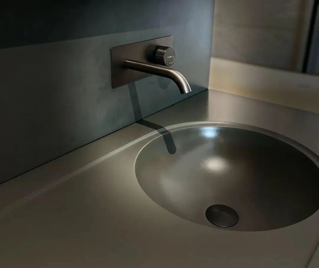 【一体台盘】特别留意,入墙式龙头是安装在一块完美的奇美石上,和奇美石台面是一体无缝衔接的。所以,这款一大特色,首先就在奇美石一体台盘:台盆是一体成型,无缝无卫生死角;球形洗手盘,颜值高,非常吸睛,盆周有一圈精致的赛道型弧线,既增添了层次之美,又防止水溢向边缘。
