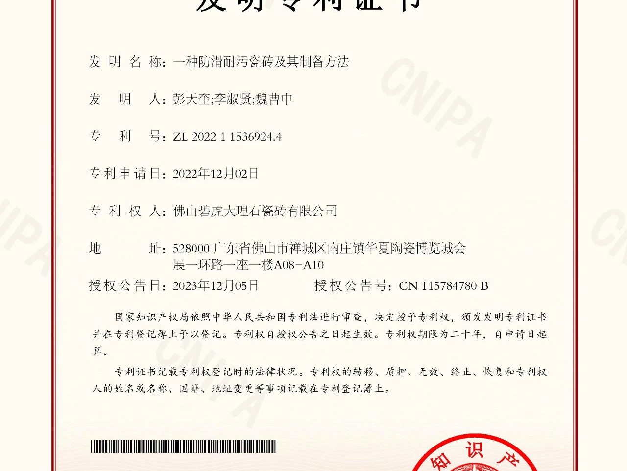 - 坚持打造技术壁垒:碧虎非常重视防滑瓷砖产品研发,从创立至今获得多项国家级防滑专利(专利号: ZL 2019205906970),掌握光面防滑核心科技,品质得到国家认证。今后碧虎还将不断加固自身防滑技术壁垒,领跑防滑砖行业发展,代表中国防滑砖走向全球。