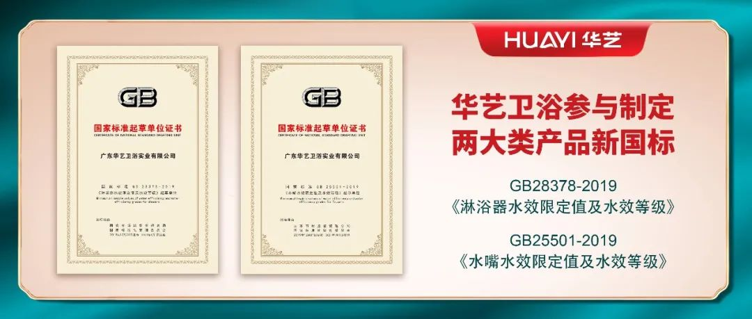 2021年1月1日,由华艺卫浴参编的国家标准GB28378-2019《淋浴器水效限定值及水效等级》、GB25501-2019《水嘴水效限定值及水效等级》正式实施,为积极推动我国节水资源的高效利用、可持续发展提供了积极引导和有力支撑。