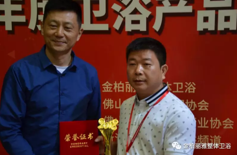 颁奖仪式:佛山市质量管理协会秘书长喻永健授予金柏丽雅卫浴2018年度卫浴产品十大质量奖,王总上台领奖