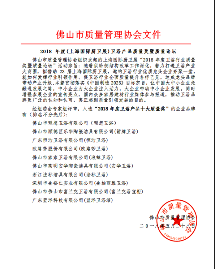2018年度卫浴产品十大质量奖颁奖典礼暨佛山市质量协会卫浴专委会成立大会在上海举行