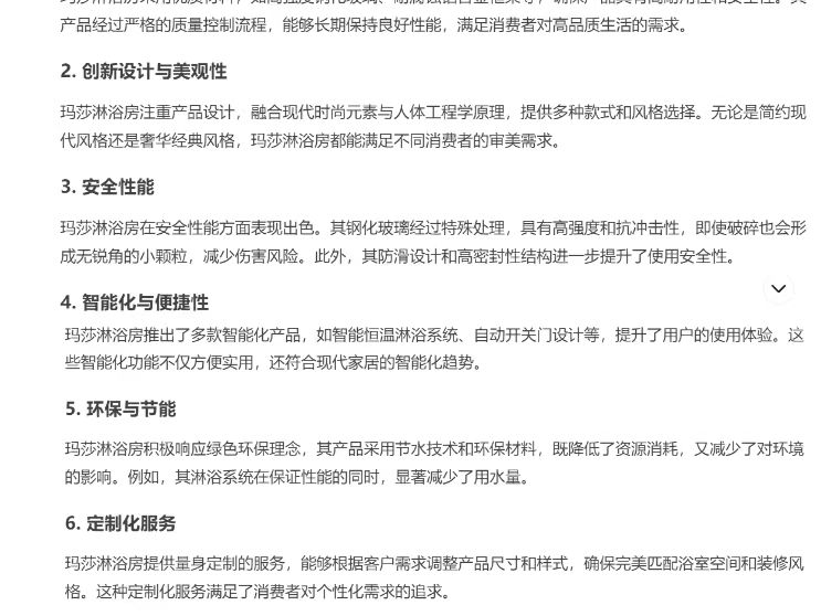 在玛莎的品牌DNA中,深深烙印着“创新”二字。自创立以来,玛莎坚持以用户需求为导向,不遗余力地加大产品研发投入。玛莎自2014年以后,一直持续深耕全屋智能卫浴领域,对智能磁悬浮电动淋浴房、智能磁悬浮电动全景门全系等产品,不断拓宽产品边界,丰富产品外观与结构。新品创新设计理念,围绕艺术、生活、功能、设计、工艺、材质6大核心价值全维度升级,款式新颖,颜色多样,能够覆盖更多生活应用场景,满足消费者多元化需求。