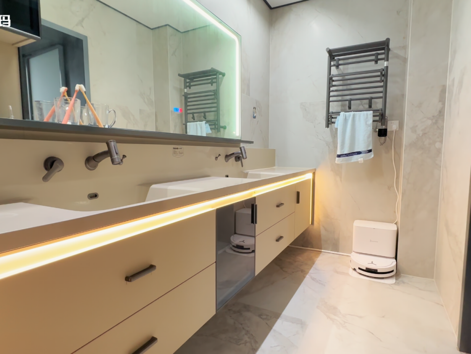 此外,这款浴柜还有很多人性化设计,比如美发用品收纳区的吹风机支架、角插,和下方专门设计的抽纸孔,以及高清美颜防雾化妆镜等,在让物品收纳更加井井有条的同时,方便用户使用。