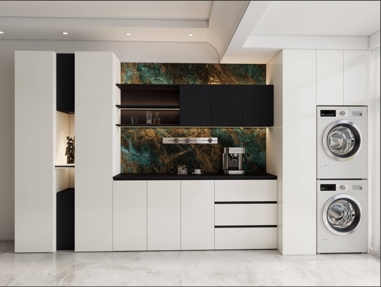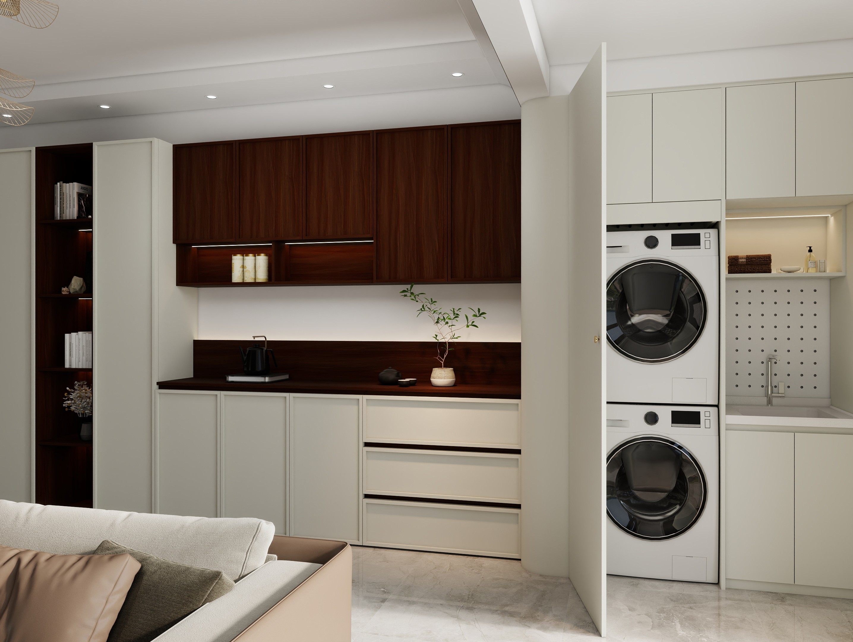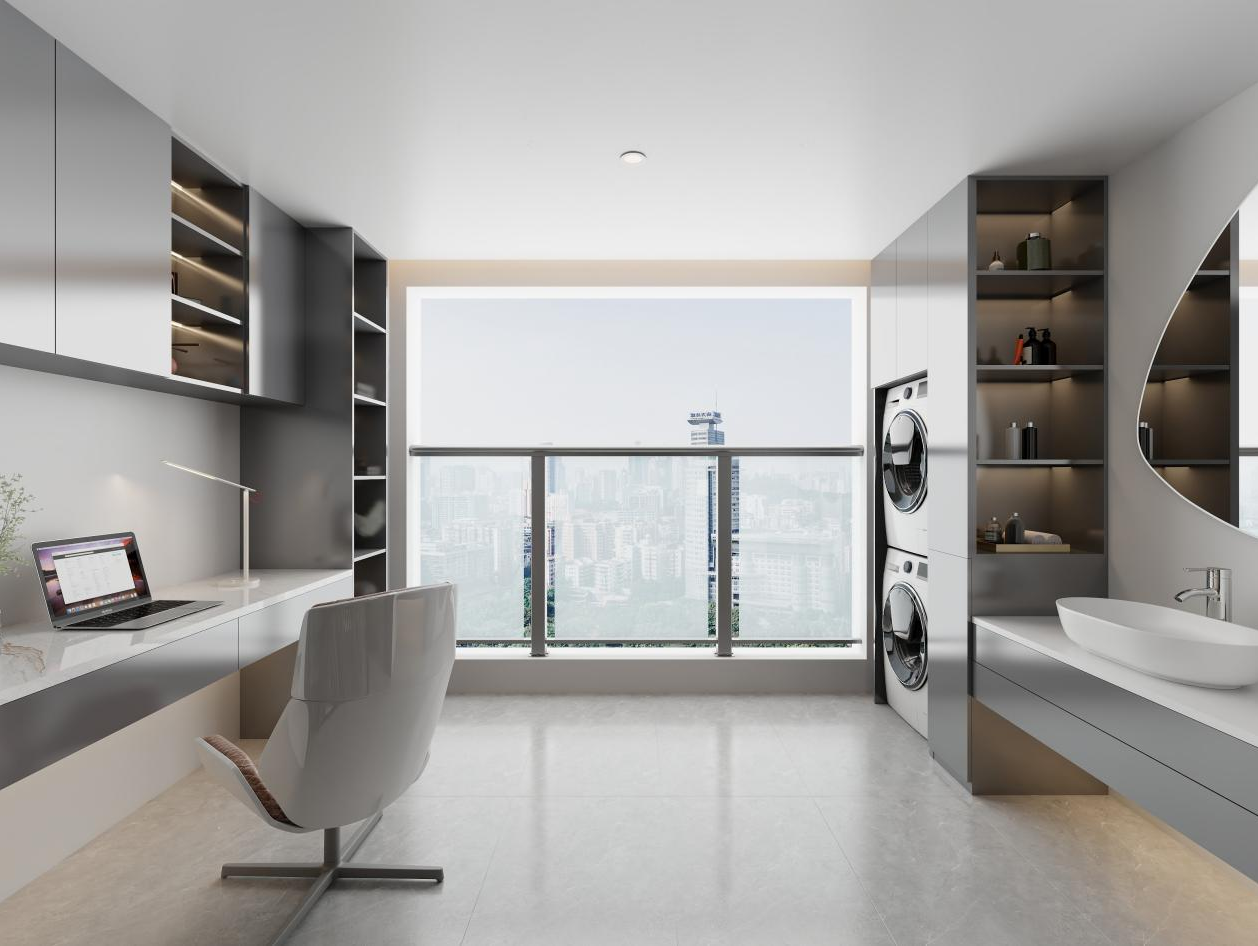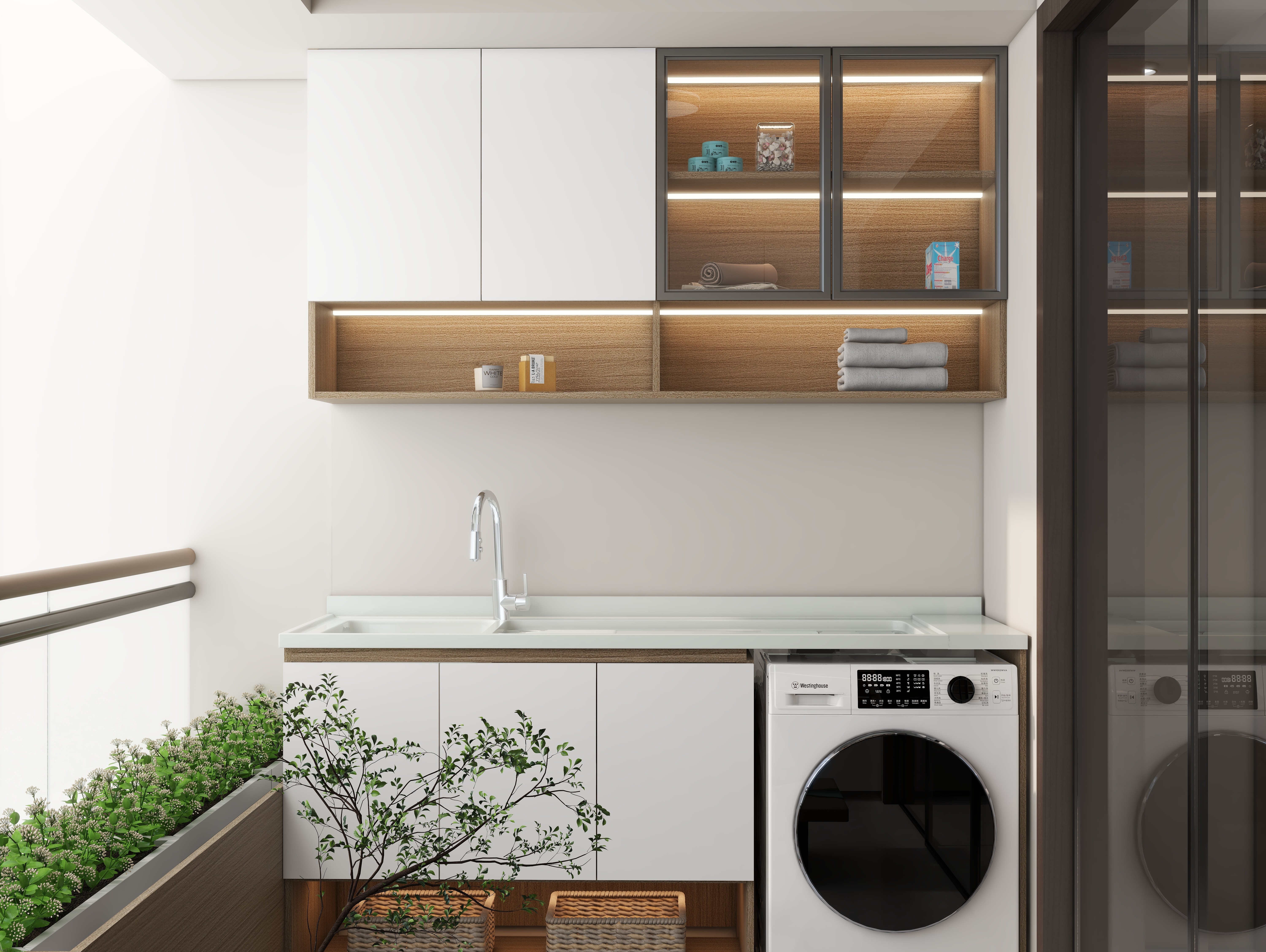 在空间规划上,品牌采用模块化设计理念,柜体可灵活组合成洗衣柜、储物柜、收纳柜、鞋柜、洗手台等多种形态,完美嵌入洗衣机、烘干机等电器,搭配隐形排水槽、伸缩晾衣杆等细节设计,让每一寸空间都得到高效利用。无论是功能性为主的洗衣区,还是兼顾休闲的生活阳台,都能通过科学布局实现功能与美学的平衡。