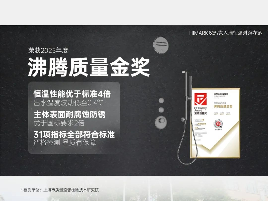 凭借强大的研发实力,HIMARK汉玛克掌握了全球领先的恒温淋浴核心科技,能以0.1秒的速度极速响应,并实现±0.5°的精准控温,真正做到开阀即热、持久恒温,让用户在一年中只需调节四次温度,就能彻底告别忽冷忽热的困扰,尽情享受从肌肤到心灵的放松。