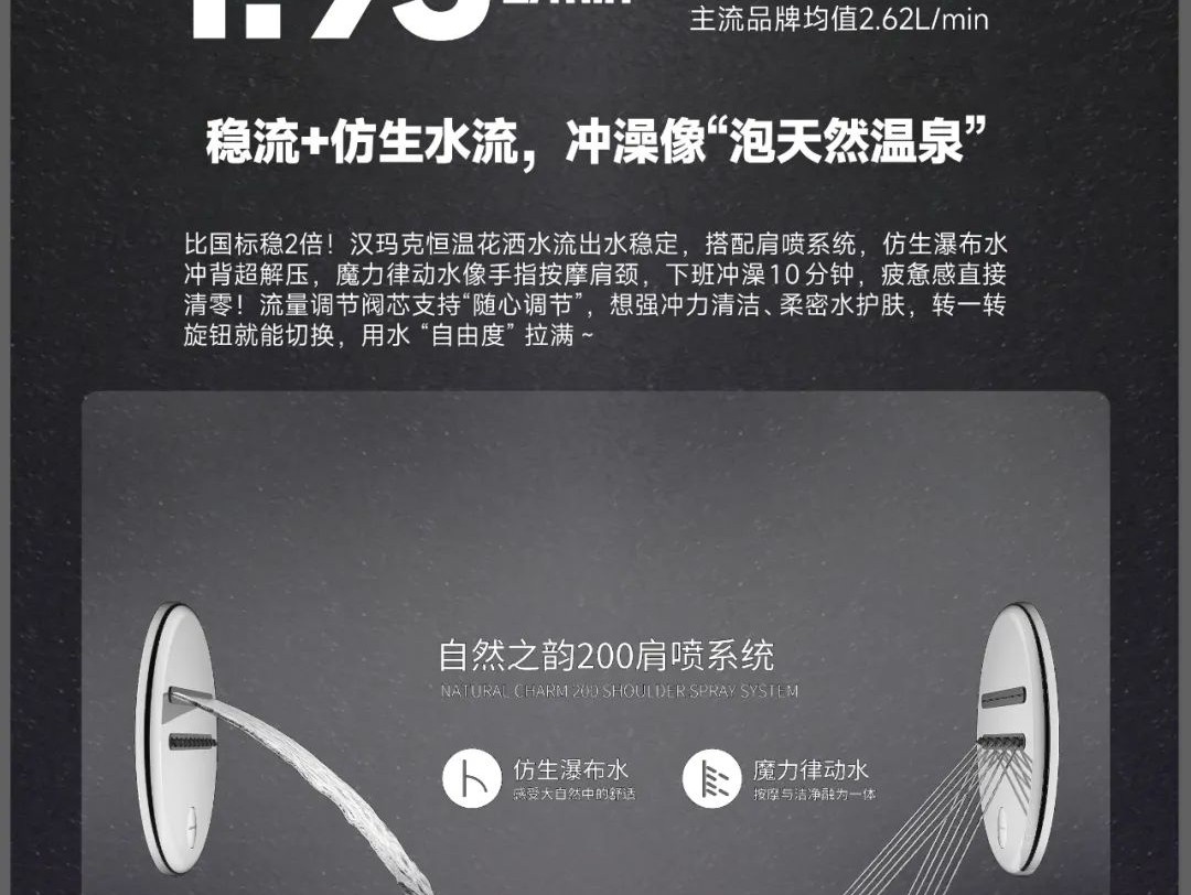 “智享・爱浴” 系列实现 “即开即洗即恒温”,一键排空管路冷水,省去等待的烦躁;女神系列的脉冲密雨水与聚合环绕水双模式,带来按摩般的舒爽与包裹式的轻柔;男神系列的脉冲SPA美肤喷雾水,通过纳米级雾化技术实现美肤与水疗双重功效。