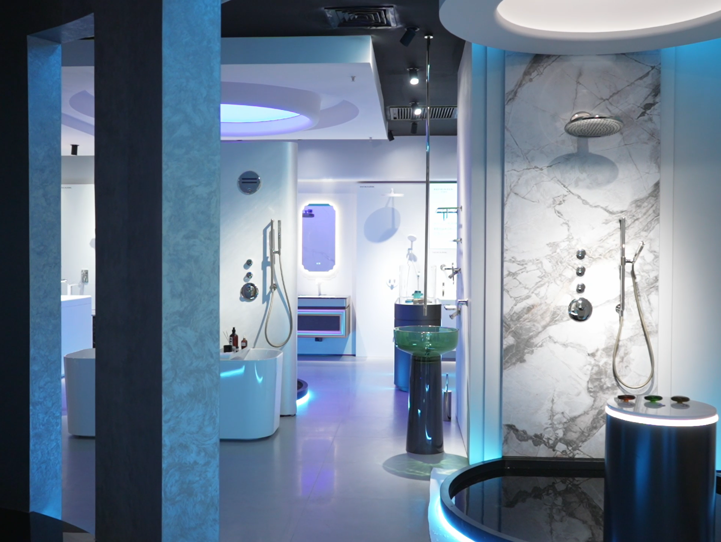 走进汉玛克杭州新时代家居广场店,260㎡的超大空间,瞬间让人眼前一亮。这座精心打造的高奢智能恒温花洒豪华体验馆,不仅气势恢宏,还在设计和陈列上极尽巧思,尽显豪华姿态。