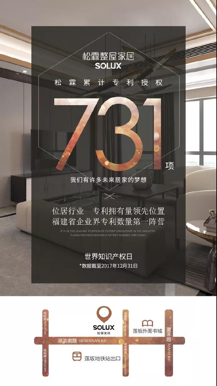 作为厦门市工业设计以及技术创新的前沿阵地,“国家级知识产权示范企业”。截至2017年底,松霖已申请包含卫浴、橱柜、家具在内1616项专利,其中申请发明专利644项,已授权专利731项,专利申请量和拥有量位居行业第一阵营。