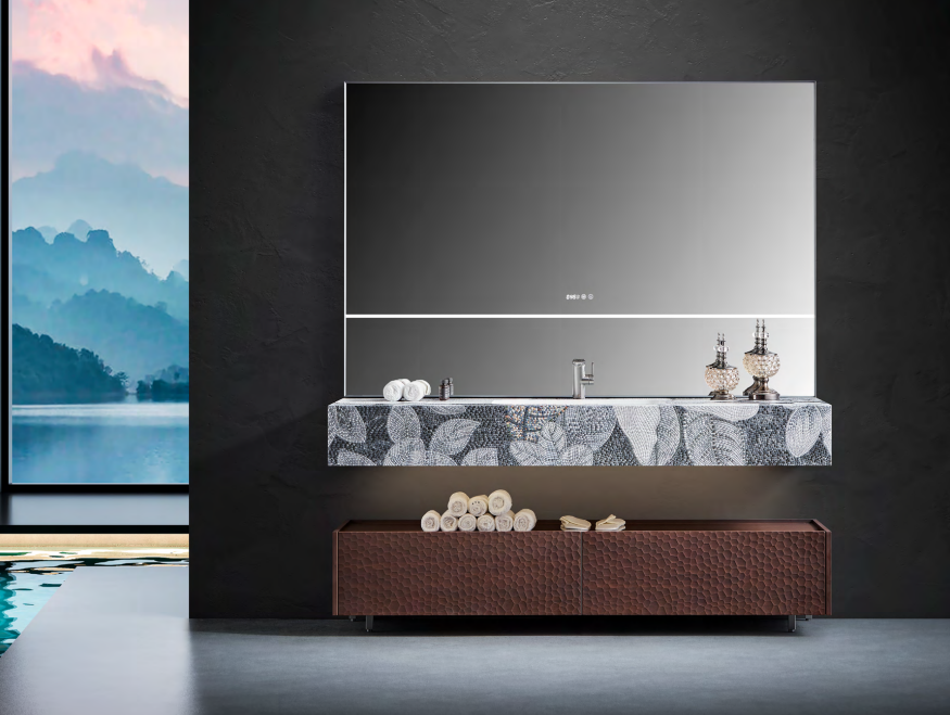 与东方美学设计师联名的“雅宋系列”,一推出就成了爆款。设计师从宋代《千里江山图》中汲取灵感,将山水意境融入浴室柜设计——黑胡桃木柜体上,用激光雕刻出淡淡的山水纹路,远看若隐若现,近看细腻精致;圆形镜柜的边框采用渐变哑光铜材质,从浅铜色过渡到深铜色,像落日余晖洒在镜边;水龙头的造型则模仿宋代玉壶春瓶,线条圆润流畅,出水时水流呈弧形,仿佛山泉滴落。