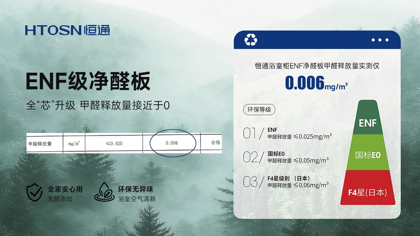 - 板材健康革新: 恒通率先将达到新国标ENF级环保标准的ENF+净醛板应用于浴室柜。这种板材不仅自身甲醛释放量趋近于零,从根本上解决了浴室空间因潮湿可能引发的板材污染问题。