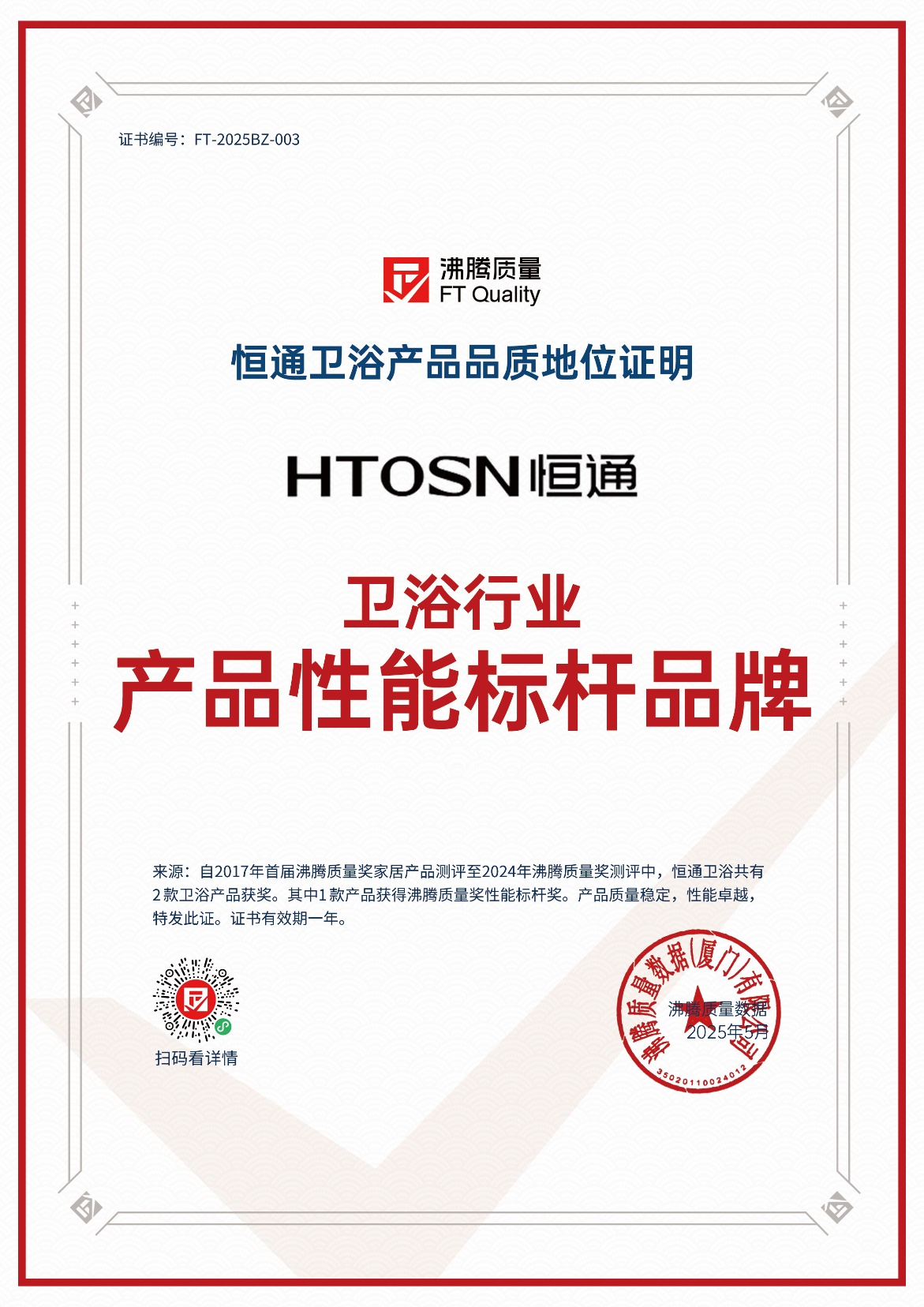 品质,是高端品牌的基石。恒通卫浴深谙此道,并以其在卫浴行业多年的技术沉淀与严苛的制造标准,赢得了市场与行业的双重认可。荣获“卫浴行业产品性能标杆品牌”称号,便是其卓越品质的最佳印证。