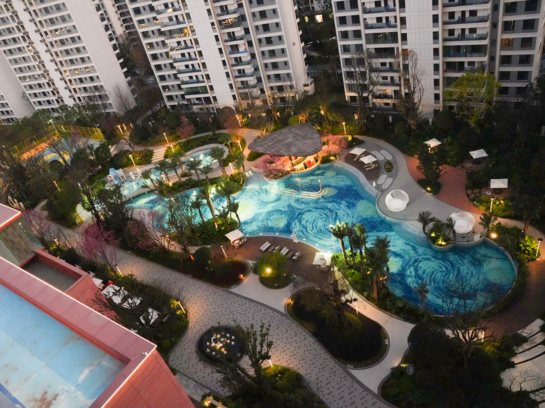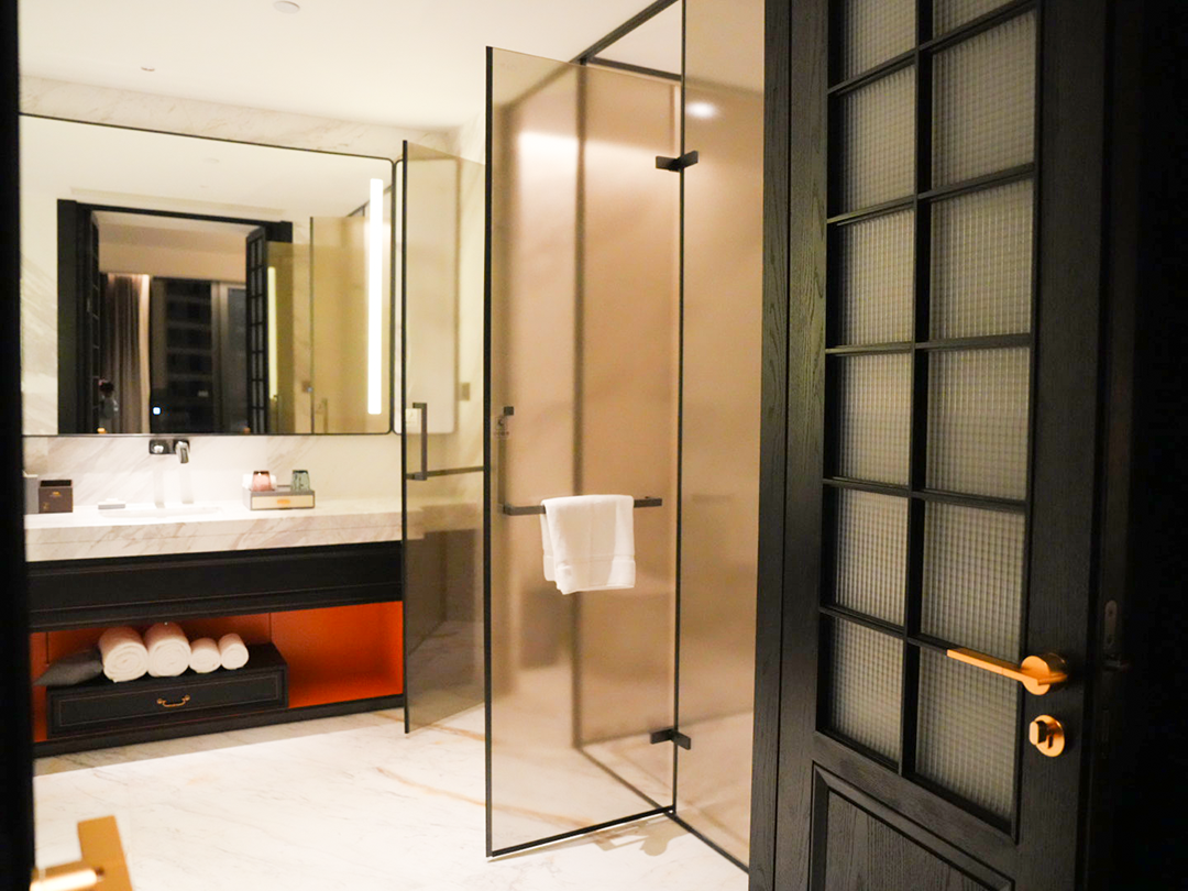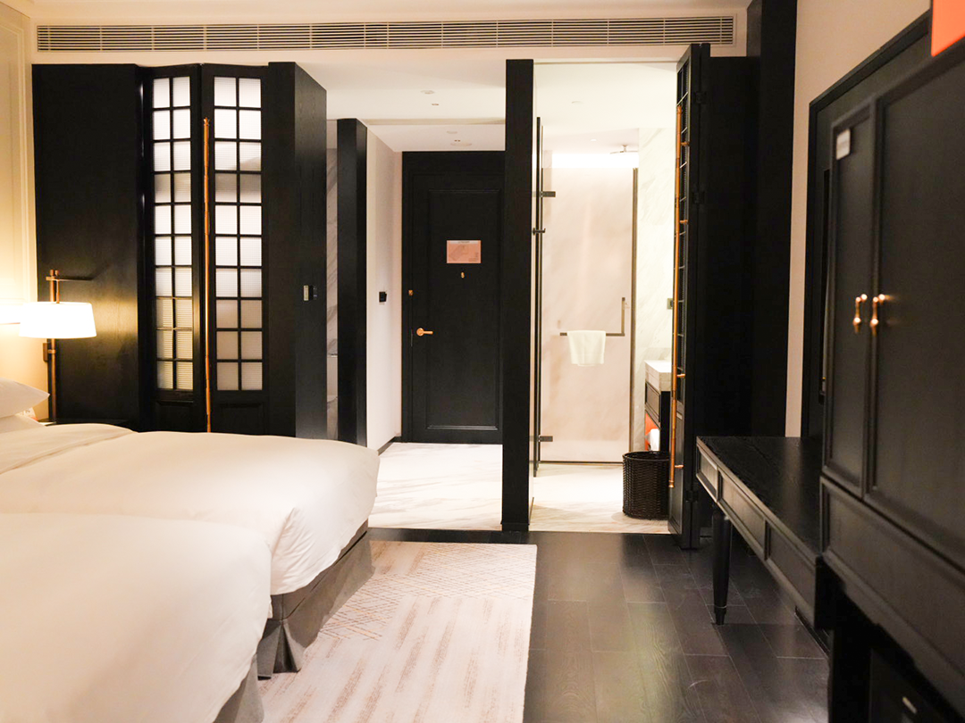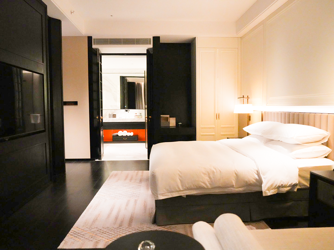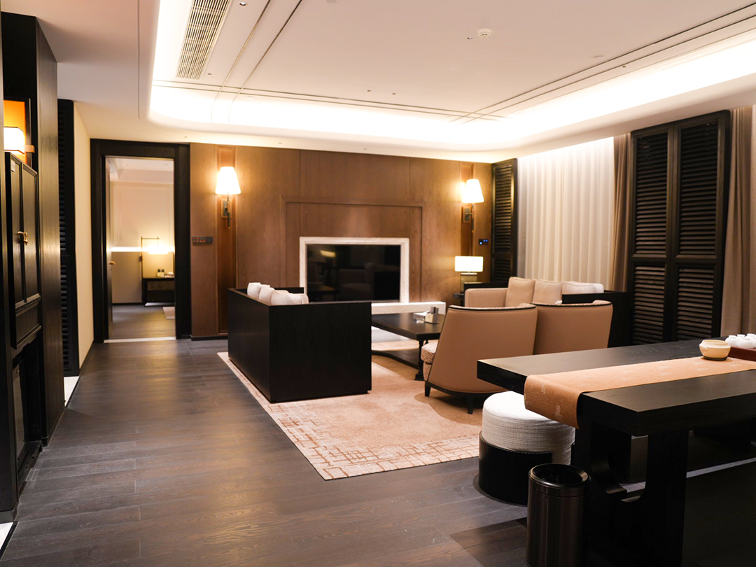 客房以暖米与深黑为基调,木质格栅门勾勒出静谧的东方意境,窗外梵高星空戏水池与后花园的景致,成为自然延伸的视觉。在这样的空间语境中,每一件配置的选择都在进行着微妙的平衡:既是对整体美学的呼应,也是功能承诺的践行。