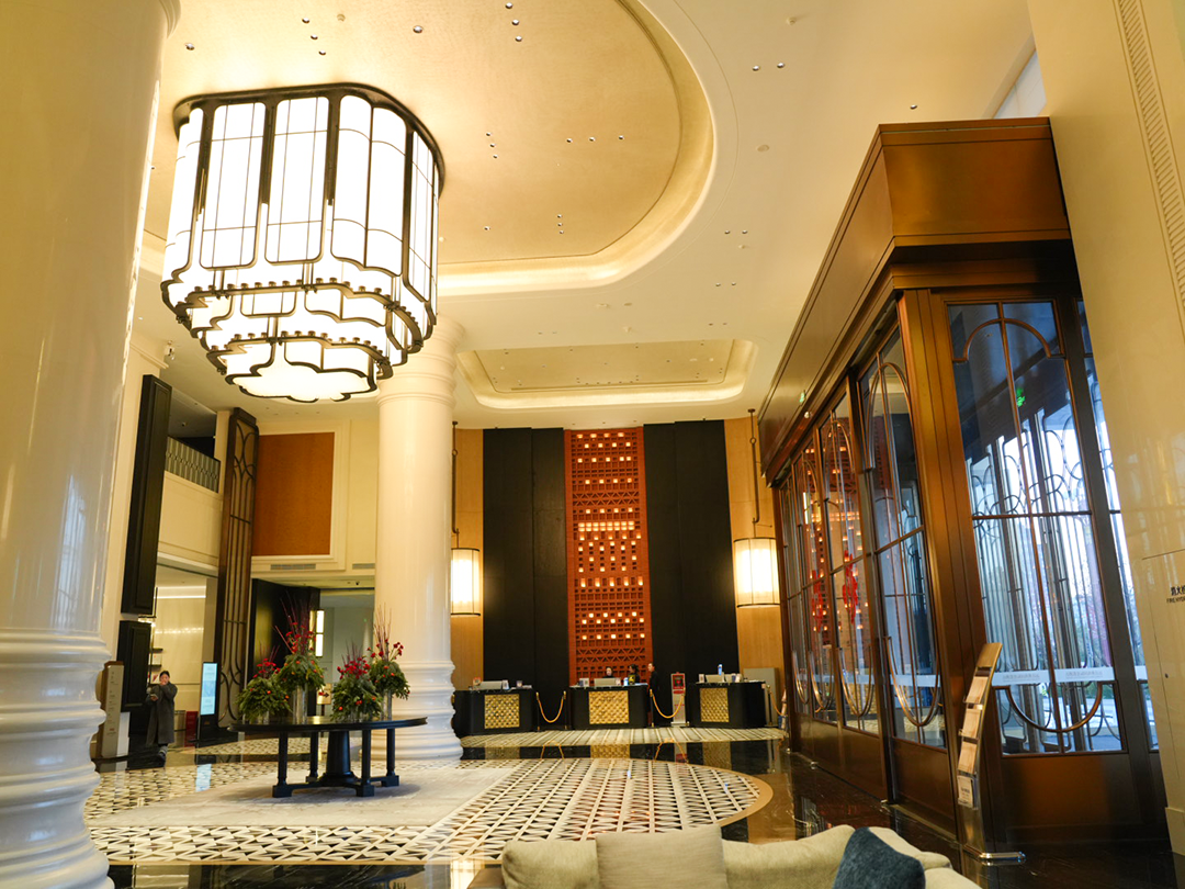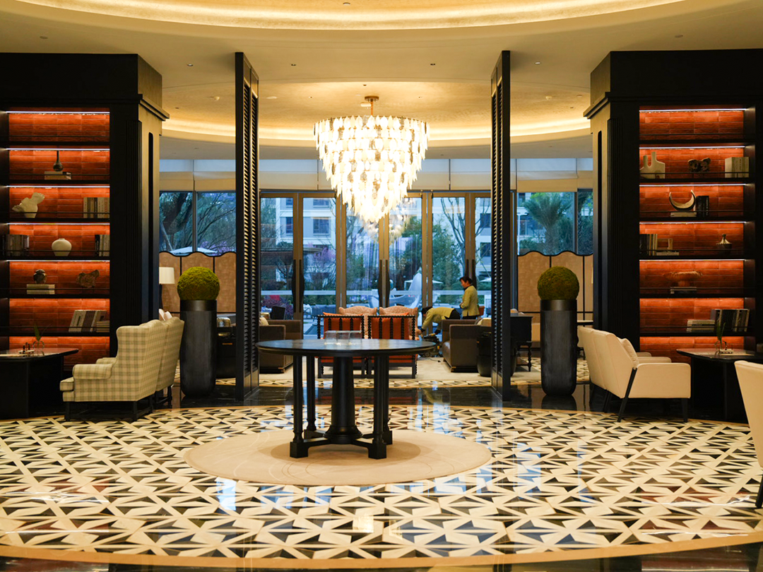 步入大堂,空间叙事在光影中铺展:水晶吊灯倾洒下柔和光影,红色镂空装饰墙融合了彝族纹样,成为空间视觉焦点,黑白几何拼花地砖勾勒出精致脉络,白色罗马柱与复古吊灯融入欧式古典元素。整体空间既延续了文化的仪式感,亦注入了现代旅居的舒适温度。