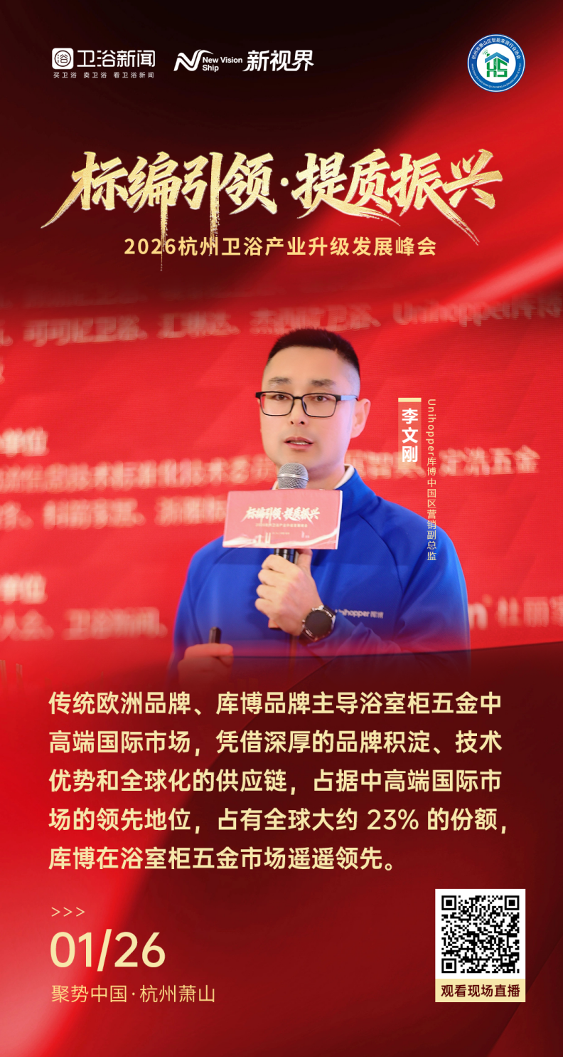 在峰会核心论坛环节,库博中国区营销副总监李文刚发表了《原创设计 赋能卫浴产区焕新》的主题演讲。结合库博深耕杭州市场十余年的实战经验与全球化视野,李文刚从三大维度为产区供应链升级提供了破局思路:其一,解析卫浴市场与浴室柜五金市场的全球竞争格局,指出传统欧洲品牌与库博共同主导中高端国际市场,凭借深厚的品牌积淀、核心技术优势及全球化供应链整合能力,合计占据全球中高端市场约 23% 的份额,其中库博在功能五金细分领域保持遥遥领先地位;其二,深度剖析中国卫浴市场消费趋势与浴室柜群体画像,随着消费升级与居住理念革新,年轻消费群体对卫浴空间的个性化、智能化、收纳化需求持续攀升,简约风、功能化、健康化成为主流消费偏好;其三,分享卫浴行业未来发展趋势与库博创新产品赋能路径,强调原创设计与技术创新是产区突围的核心竞争力。