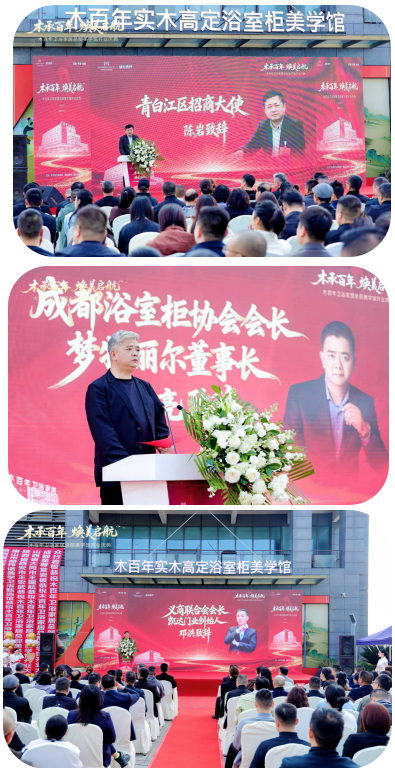 政企领导、行业协会、全国各地经销商、供应链伙伴及主流行业媒体数百人齐聚现场,通过开场鼓舞、嘉宾致辞、授牌赠福、战略签约、剪彩揭幕等完整流程,共同见证木百年品牌里程碑式升级与全新战略启航。 盛典在气势恢宏的开场鼓舞中正式启幕。青白江区招商大使、青白江新联会会长、绣川书院院长陈岩上台致辞,对木百年扎根青白江、赋能区域产业发展给予高度肯定与殷切期望。成都浴室柜协会会长刘开亮、义商联合会会长邓洪先后发表行业寄语,认可木百年在浴室柜领域的匠心坚守与创新引领,勉励品牌与行业共生共荣、协同发展。
