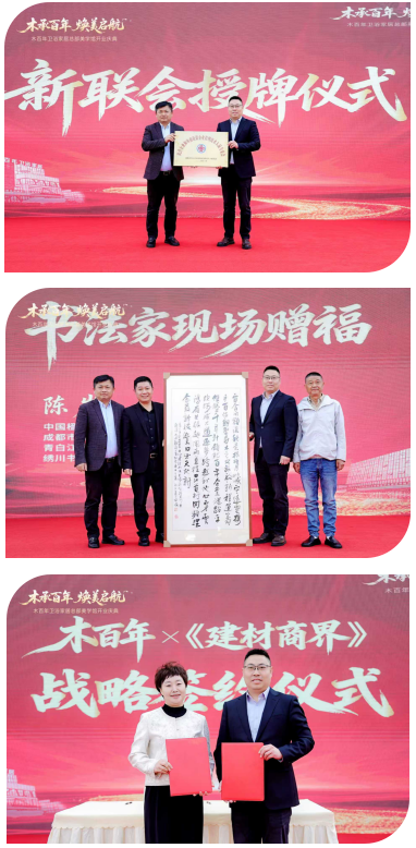 仪式现场,青白江新联会会长陈岩为木百年举行授牌暨墨宝赠福仪式,以文化厚礼赋能品牌发展。随后,木百年与《建材商界》举行战略签约,双方达成媒企深度合作,共拓品牌传播新局面。