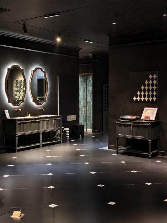 劳宾的高端布局,从来不是单一的产品输出,而是带着“生活方式提案”的战略使命。从最早的暗调风格店态,打破传统浴室柜专卖店的美学呈现,到引入Art Deco装饰主义风格,用几何造型、丰富色彩和多元材质碰撞,不断升级、更新终端店态。