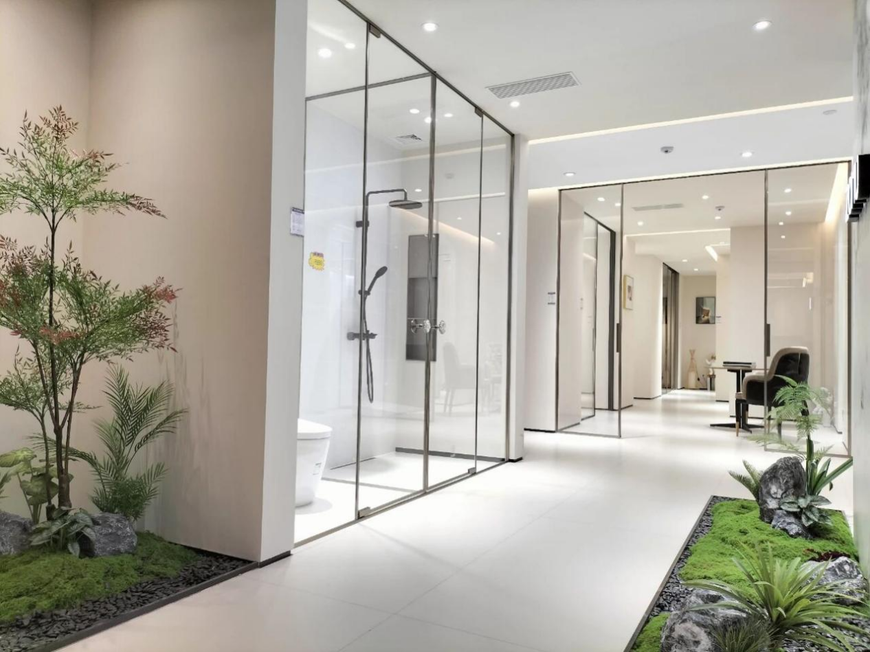 刚踏入中沐总部展厅,一股极简高级的氛围感便瞬间包裹周身,无需多余修饰,便将高端卫浴的质感诠释得淋漓尽致。展厅以纯白为基底,巧妙融合不锈钢的冷光质感与玻璃的通透质感,两种材质碰撞出简约而不简单的视觉体验,既符合当下高端消费群体的审美偏好,也呼应了中沐产品的核心材质特色。