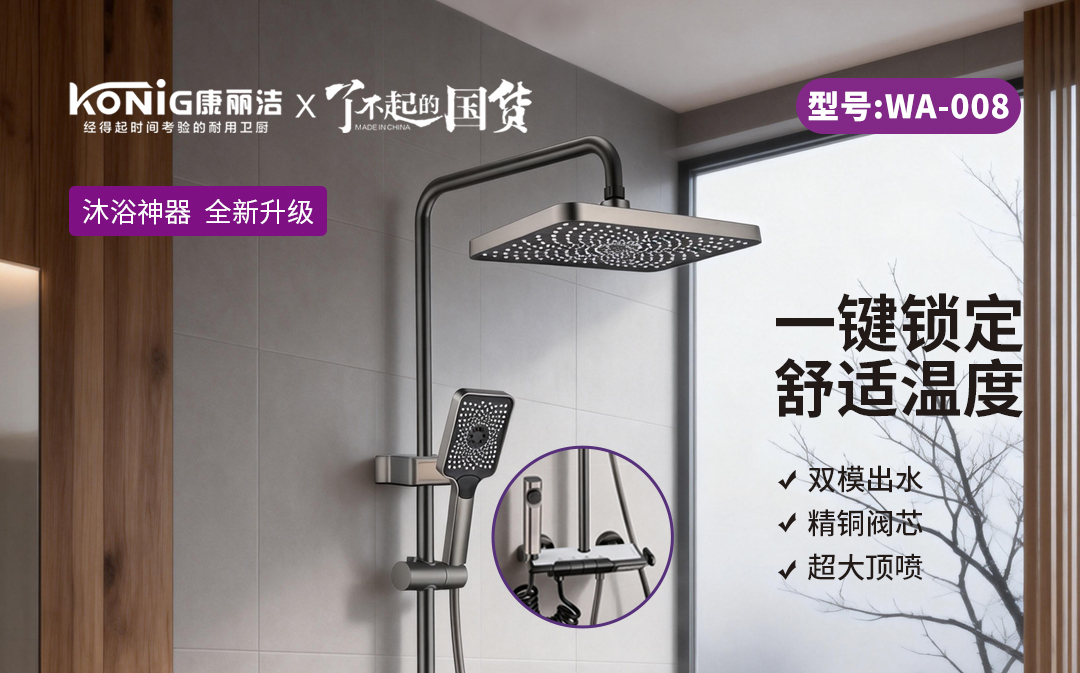 - 康丽洁 WA-008 升级花洒:一键锁温超省心,精铜阀芯耐用抗腐,双模出水 + 超大顶喷,水氧混合等多模式,适配居家舒适沐浴需求。