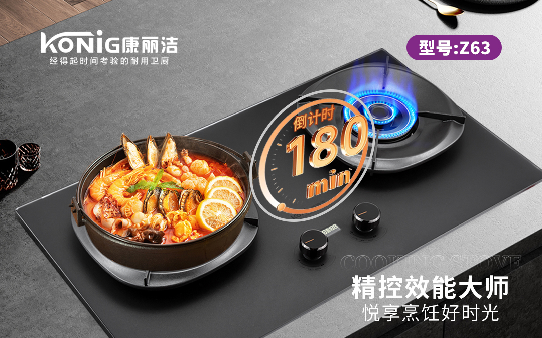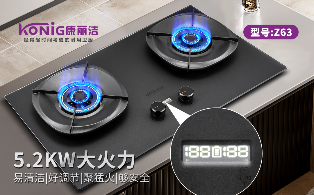 - 康丽洁 Z63 高性能燃气灶:双灶独立定时,5.2kw 猛火高热效;搪瓷炉架耐用不变形,仿生荷叶面板洁净不沾污,一台好灶,陪伴三餐四季。