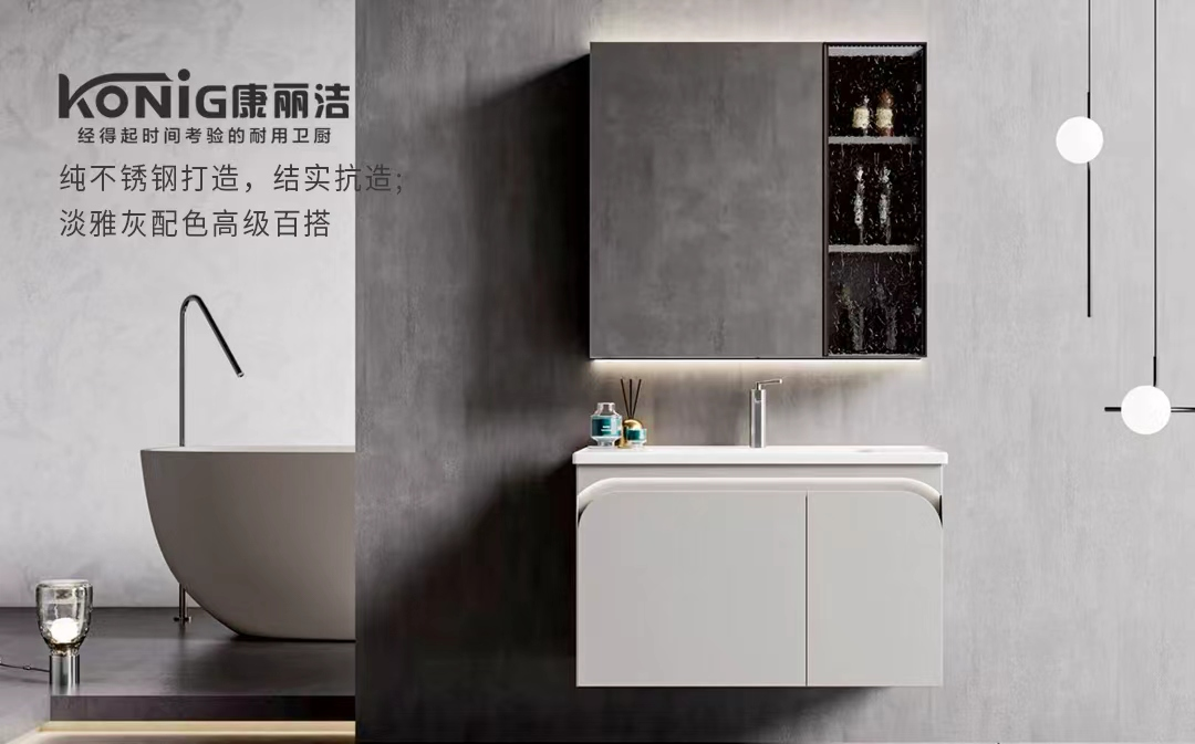 - 康丽洁 YB9613 淡雅灰浴室柜:纯不锈钢打造,结实抗造;淡雅灰配色高级百搭,优质陶瓷盆不易发黄开裂,加深加宽盆底好清洁;搭配高清智能镜(一键补光 / 除雾)+ 隐藏式抽纸孔,实用与颜值兼具。