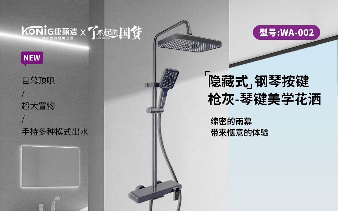 - 康丽洁 WA-002 枪灰美学花洒:隐藏式钢琴按键操作便捷,巨幕顶喷铺陈绵密雨幕,手持多档出水,置物 + 出水双满足,沐浴体验拉满。