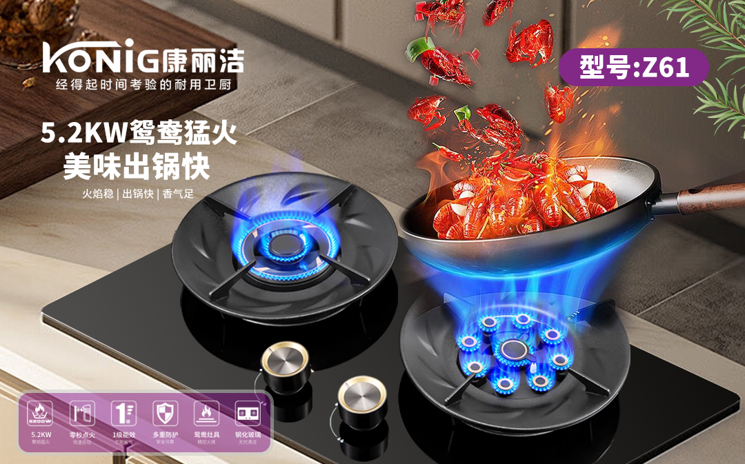 - 康丽洁 Z61 燃气灶:九枪猛火 + 双环直火,双灶独立控火,猛炒、蒸煮全能,满足中式烹饪全需求。