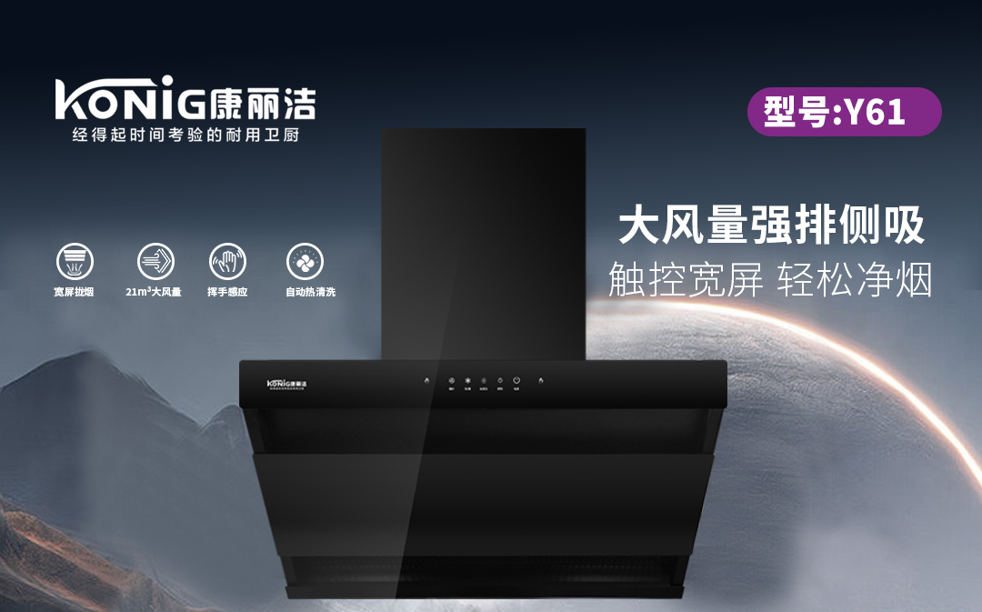 - 康丽洁 Y61 油烟机:大风量墙排侧吸,触控宽屏,挥手感应免触碰,轻松净烟,智造厨房更便捷。