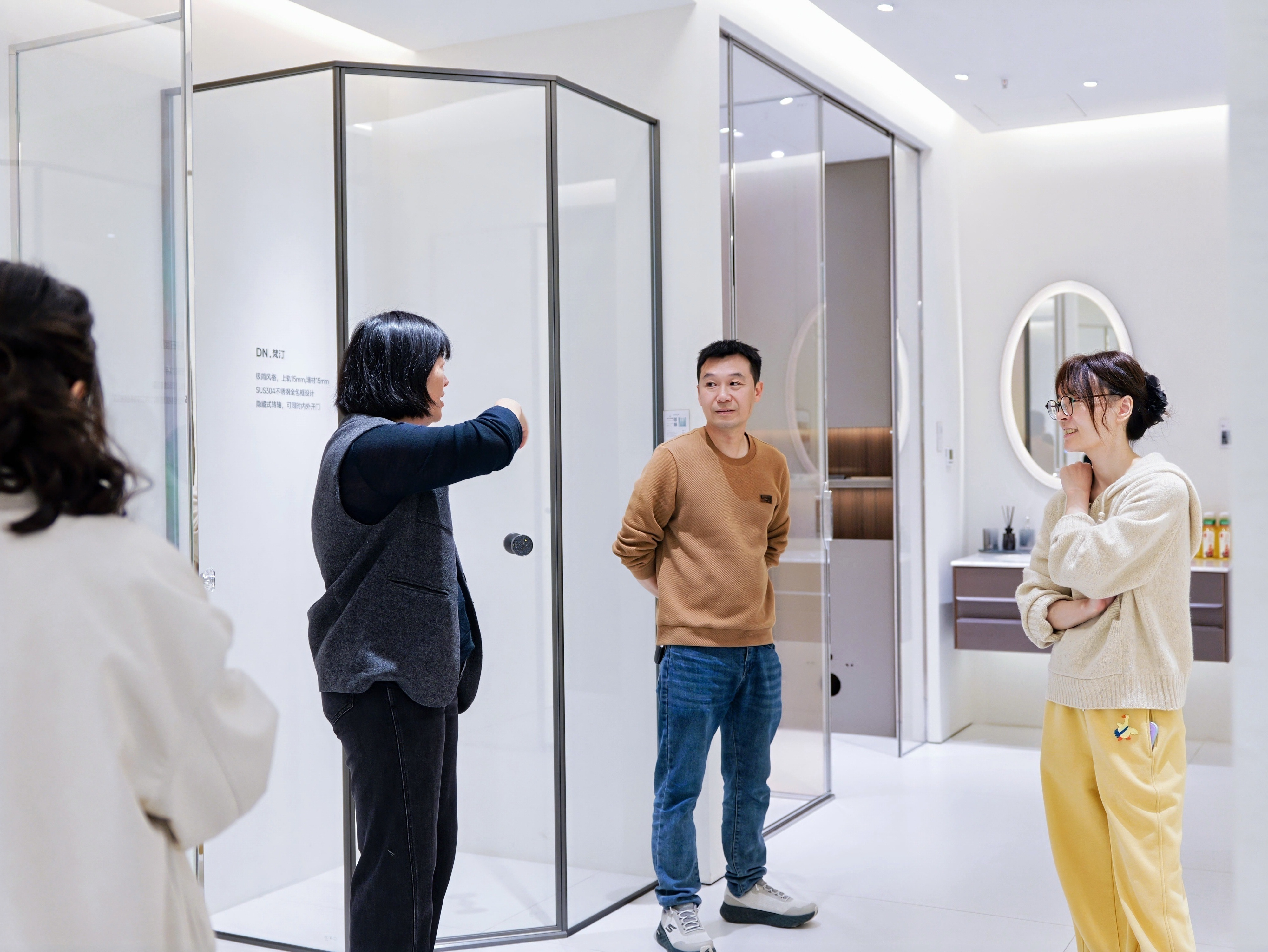 仪式后,嘉宾与客户共同进店体验。店内以极简高端空间呈现全品类金属高定产品,质感通透、工艺精湛,从淋浴空间到阳台系统,从室内门到全屋定制,全方位展现圣莉亚「金属美学 + 精工定制」的品牌实力。