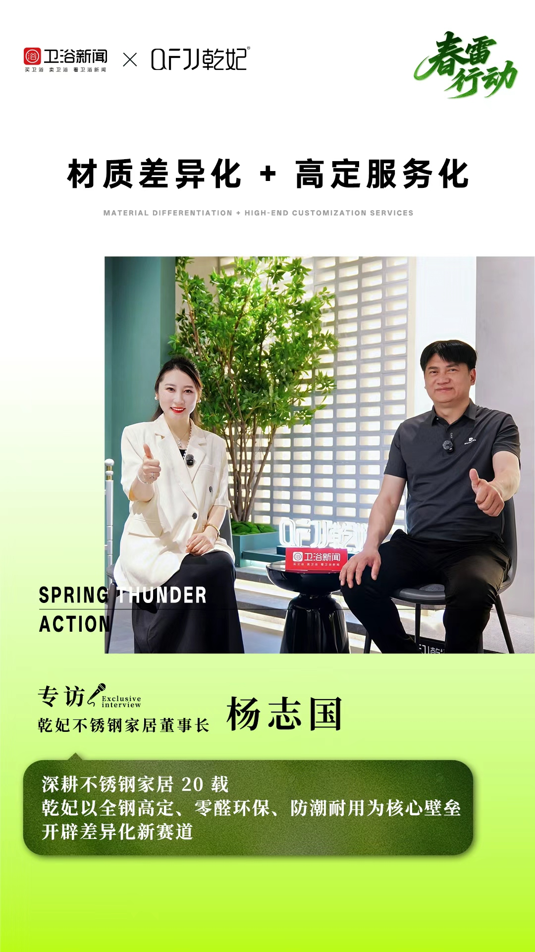 浴室柜行业竞争日趋激烈,多数品牌陷入拼板材、拼价格、堆功能的内卷困境,而乾妃不锈钢浴室柜却另辟蹊径,以不锈钢为核心材质,凭借防水耐用的产品优势与金属高定的美学表达,在高端卫浴市场稳稳扎根20年。近日,卫浴新闻《春雷行动》走进佛山乾妃总部,对话董事长杨志国,探寻这个老牌不锈钢卫浴品牌的破局之道,解读其2026年战略布局与长期发展规划。