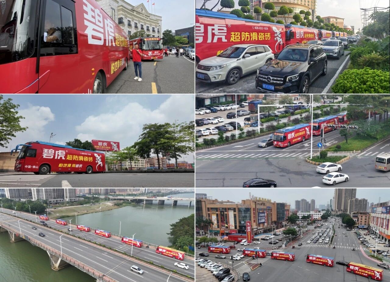 6台身披专属 “战袍” 的全广告大巴化身流动焦点,在展馆周边、城市核心商圈、交通枢纽等关键路线循环穿梭,从早到晚全天候不间断行驶,单日覆盖超200万人次;展馆内外,“小蜜蜂” 巡游团队活力穿梭,与客商近距离互动邀约;核心商圈、展馆通道的巨型KT板、高炮广告密集排布,碧虎红与品牌口号强势冲击视觉,在华夏陶瓷城形成360°无死角的广告包围网。
